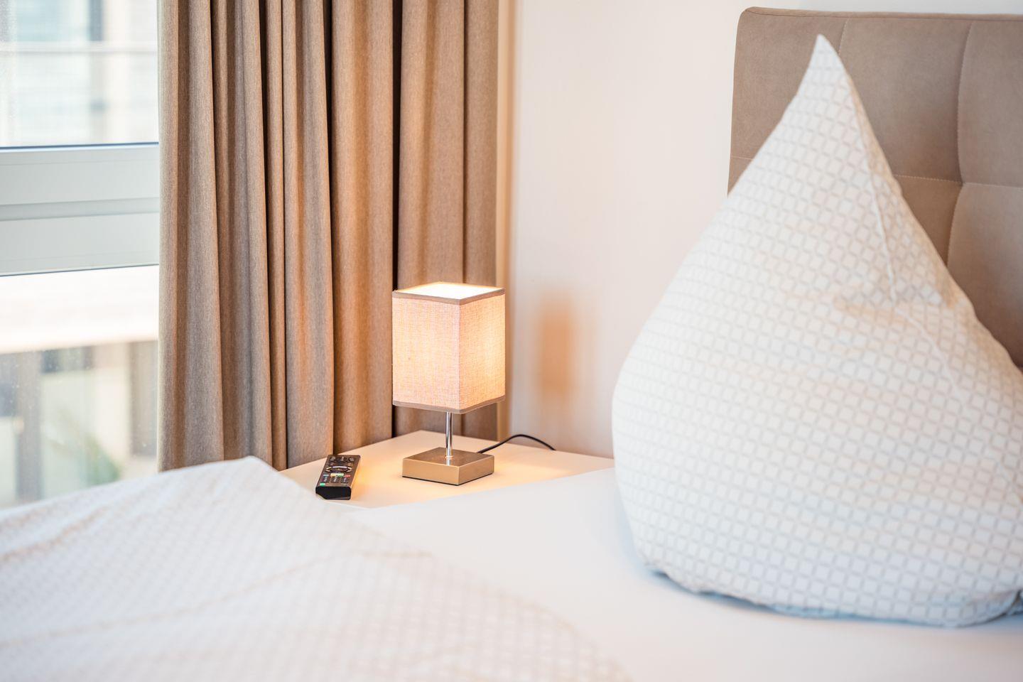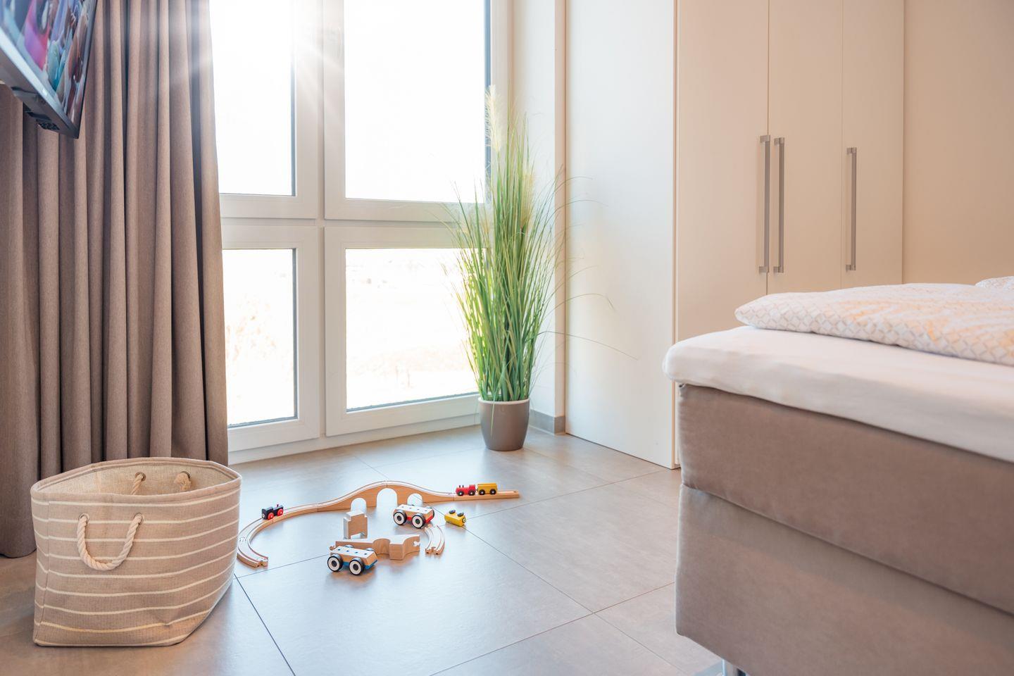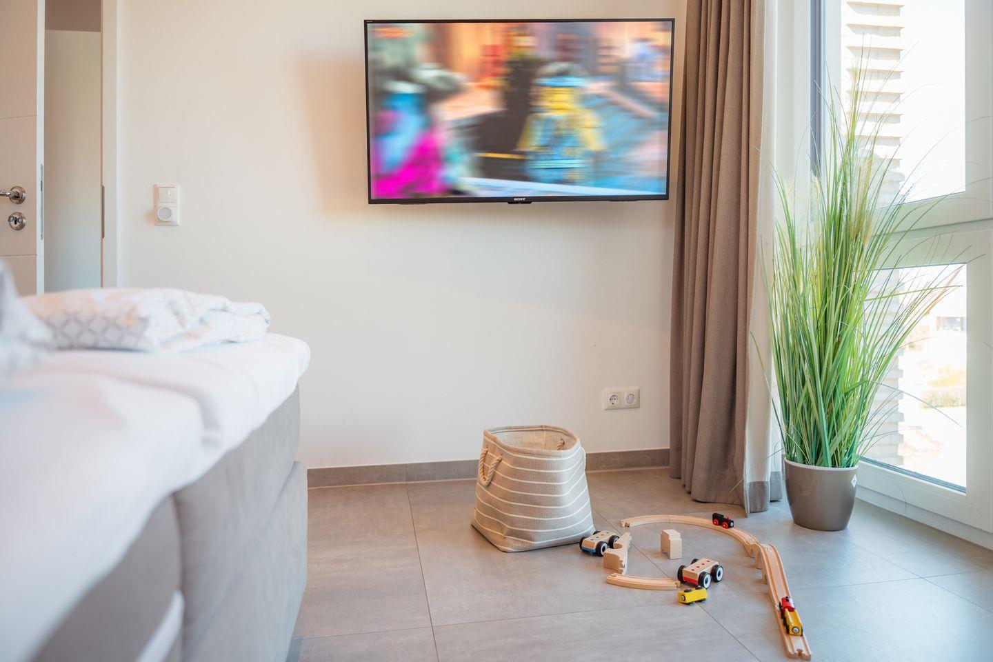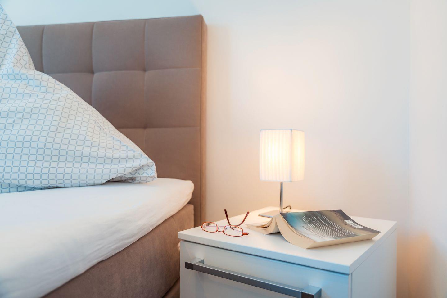 In dem Penthouse befinden sich zwei Schlafzimmer mit je einem Boxspring-Doppelbett (jeweils ein durchgehender Topper 180x200 cm). Extra hohe Komfortmatratzen mit zusätzlichen kuschelig-weichen Toppern sowie Fenster mit lärm- und wärmedämmender Dreifachverglasung sorgen für entspanntes Schlafen. Beide Schlafzimmer sind mit Full-HD-Flachbild-TV und Fliegengittern ausgestattet.