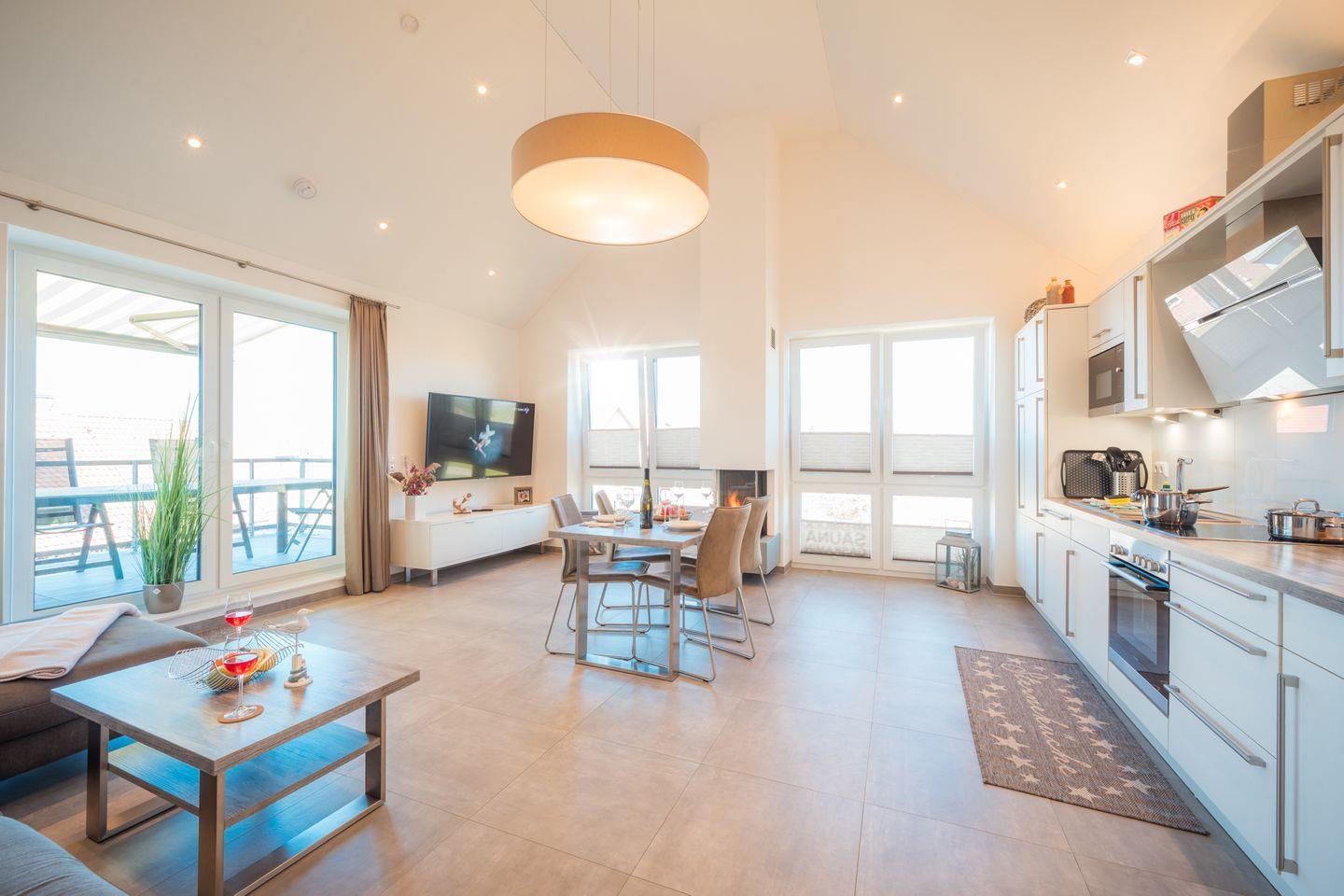 Das Premium-Penthouse „Oceans Eleven“! Eine eigene Privatsauna, wohlig-warme Stunden am Gaskamin mit Meerblick und großzügiges Raumgefühl durch bis zu 5 Meter hohe Räume.