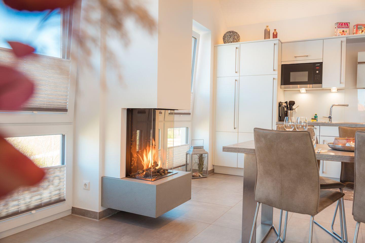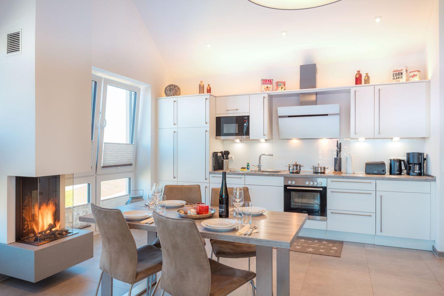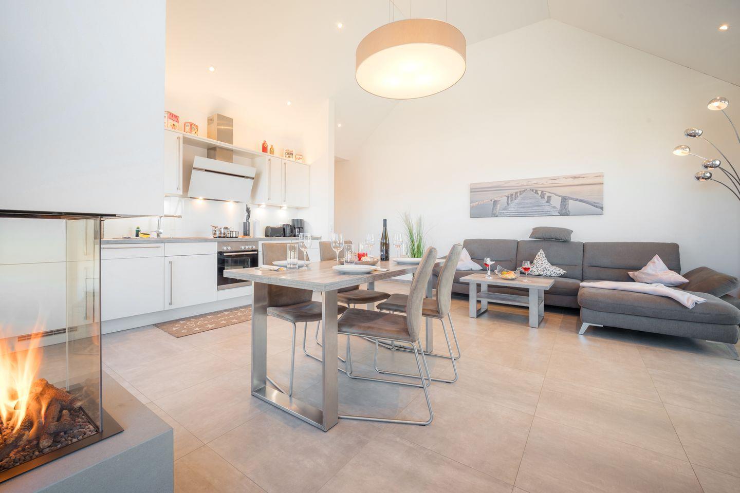 Der großzügige, lichtdurchflutete Wohnraum mit moderner Küchenzeile besticht auch bei ungemütlichem Wetter durch seinen Gaskamin mit wohliger Wärme auf Knopfdruck. Am zentralen Esstisch genießen Sie im Feuerschein vor dem Kamin Ihr Urlaubsmenü - oder spielen eines der Gesellschaftsspiele, die wir für Sie bereithalten. Oder Sie relaxen auf der Wohnlandschaft mit Ottomane vor dem eindrucksvollen 65 Zoll-4K-Flachbild-TV. Schnelles WLAN ist natürlich auch inklusive.