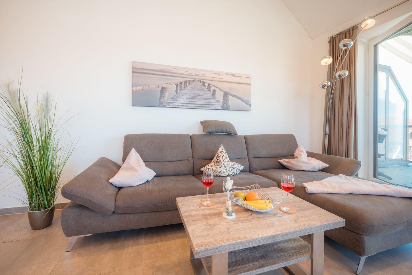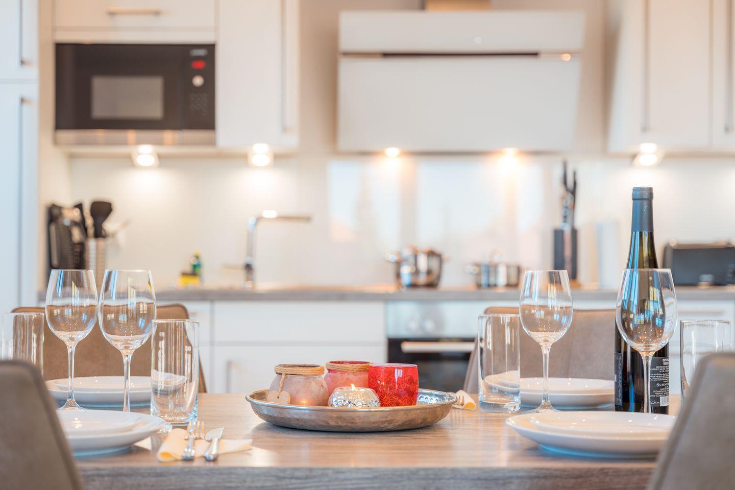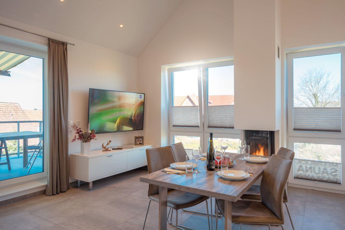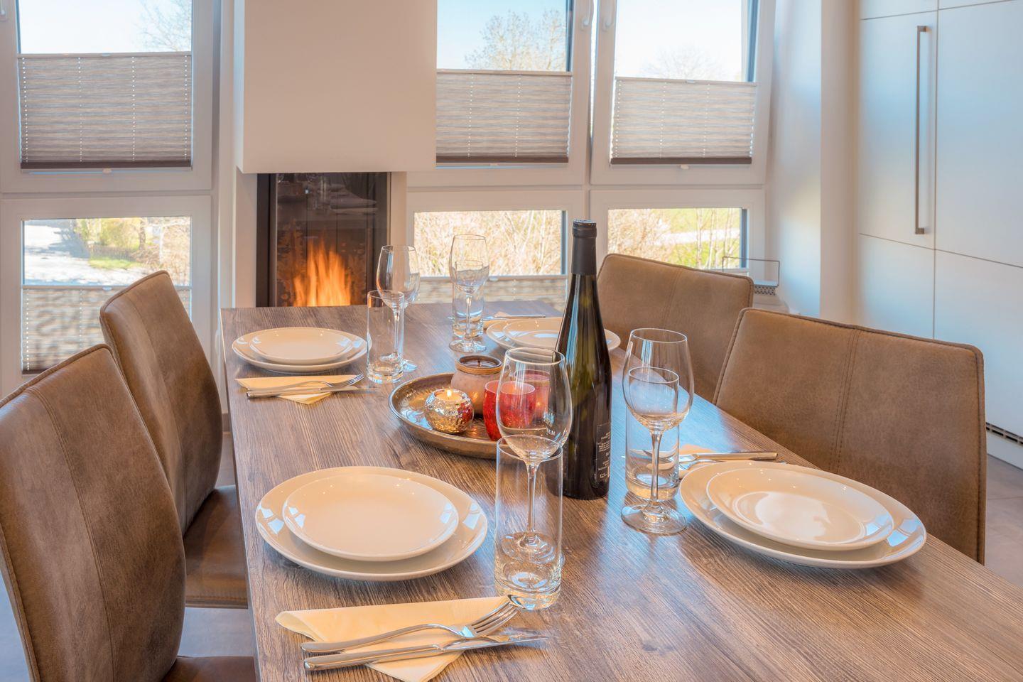 Der großzügige, lichtdurchflutete Wohnraum mit moderner Küchenzeile besticht auch bei ungemütlichem Wetter durch seinen Gaskamin mit wohliger Wärme auf Knopfdruck. Am zentralen Esstisch genießen Sie im Feuerschein vor dem Kamin Ihr Urlaubsmenü - oder spielen eines der Gesellschaftsspiele, die wir für Sie bereithalten. Oder Sie relaxen auf der Wohnlandschaft mit Ottomane vor dem eindrucksvollen 65 Zoll-4K-Flachbild-TV. Schnelles WLAN ist natürlich auch inklusive.