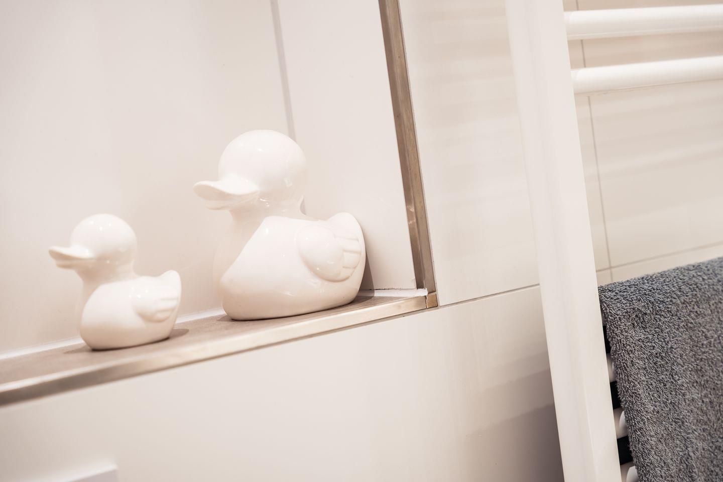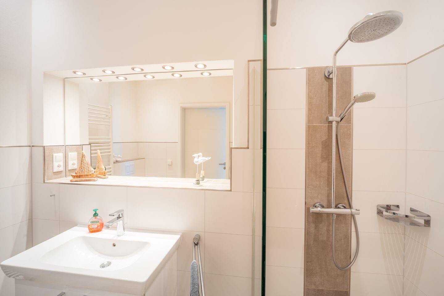 Das Bad liegt nur wenige Schritte neben der Sauna. Hier lädt die Walk-In-Sommerregendusche mit zusätzlicher Handbrause zum Abkühlen zwischen den Saunagängen ein. Zwei Handtuchheizkörper, ein integriertes Radio, ein großer Spiegel und viel Ablagefläche runden die komfortable Badausstattung ab.