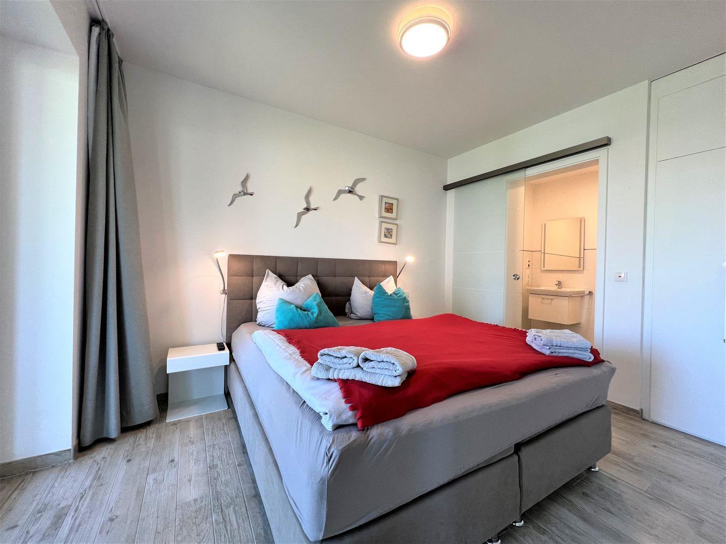 Über den Wohn-Essbereich gelangen Sie in Ihr persönliches Schlafzimmer. Das Schlafzimmer mit komfortablem Doppel-Boxspringbett und Kleiderschrank garantiert angenehme Träume. Auch hier steht Ihnen ein Flat-TV zur Unterhaltung zur Verfügung. Von hier aus können Sie ebenfalls direkt auf den großen Balkon gelangen.