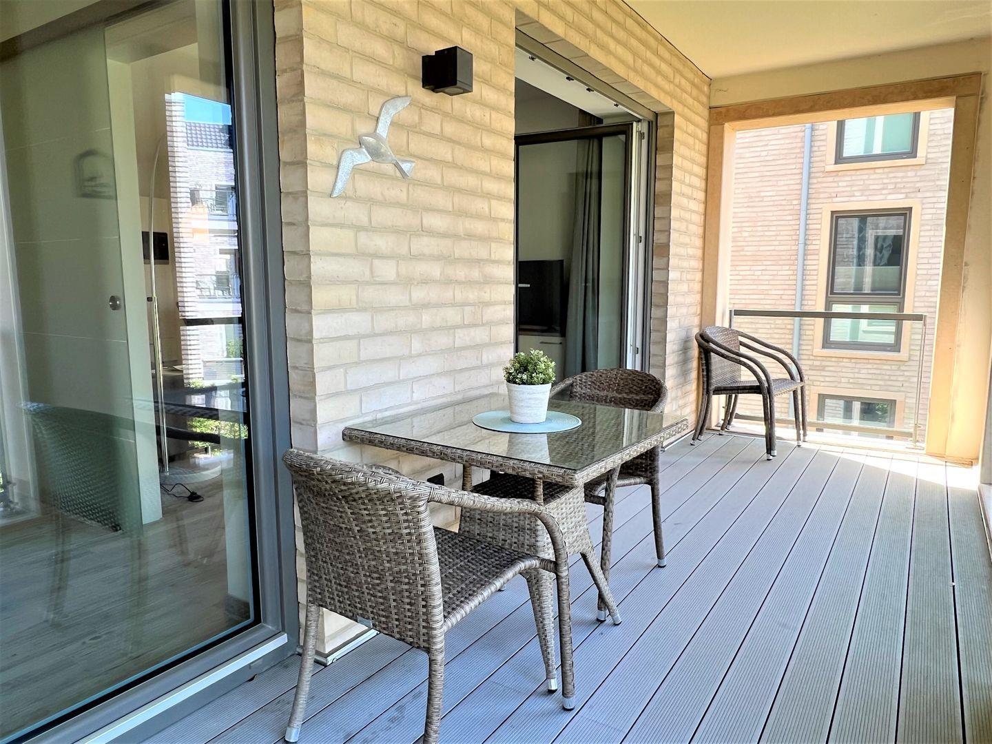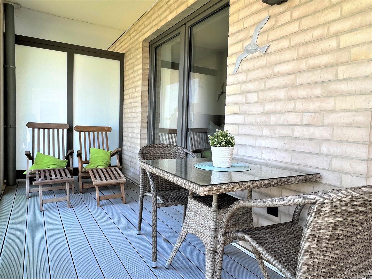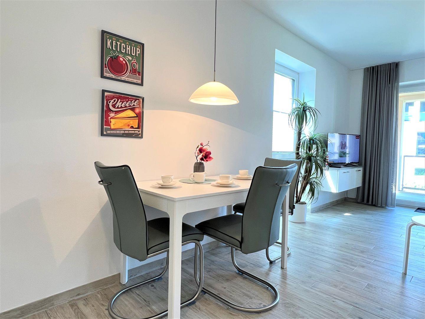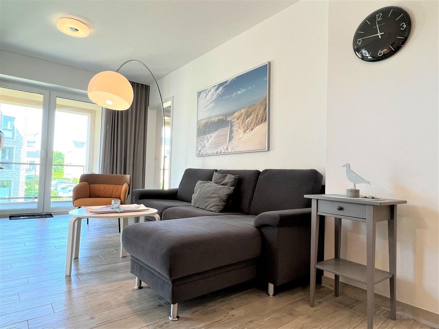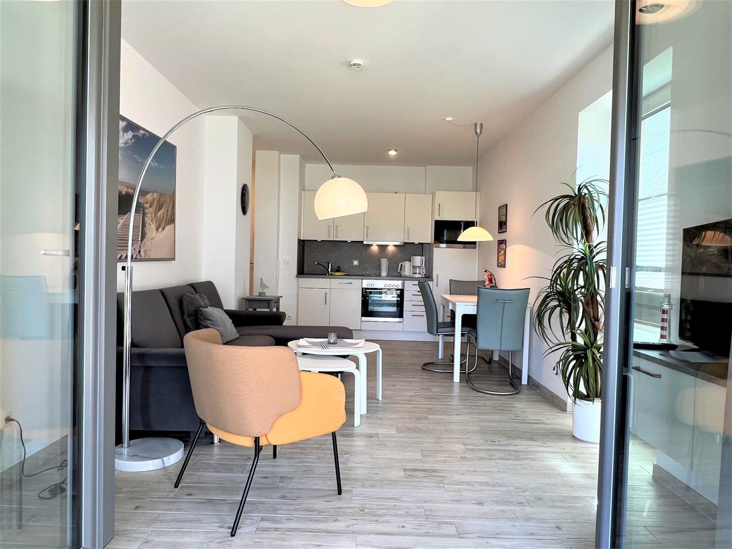 Über einen Aufzug oder die Treppe gelangen Sie zum Apartment. Vom Eingangsbereich mit praktischer Garderobe geht es in Ihr Wohlfühldomizil. Der Essbereich mit Esstisch und vollausgestatteter Küche ist mit besten Markengeräten ausgestattet. Fließend geht es über zum großzügigen Wohnbereich mit gemütlicher Eckgarnitur und großem Flat-TV auf einem schwebenden Sideboard. Von dort gelangen Sie auf den großen, überdachten Westbalkon mit modernen Gartenmöbeln. Dieser ist über eine Stufe erreichbar und daher nicht rollstuhlgerecht. Auch zwei Sonnenliegen aus edlem Massivholz laden zur Entspannung bei tollem Wetter ein.