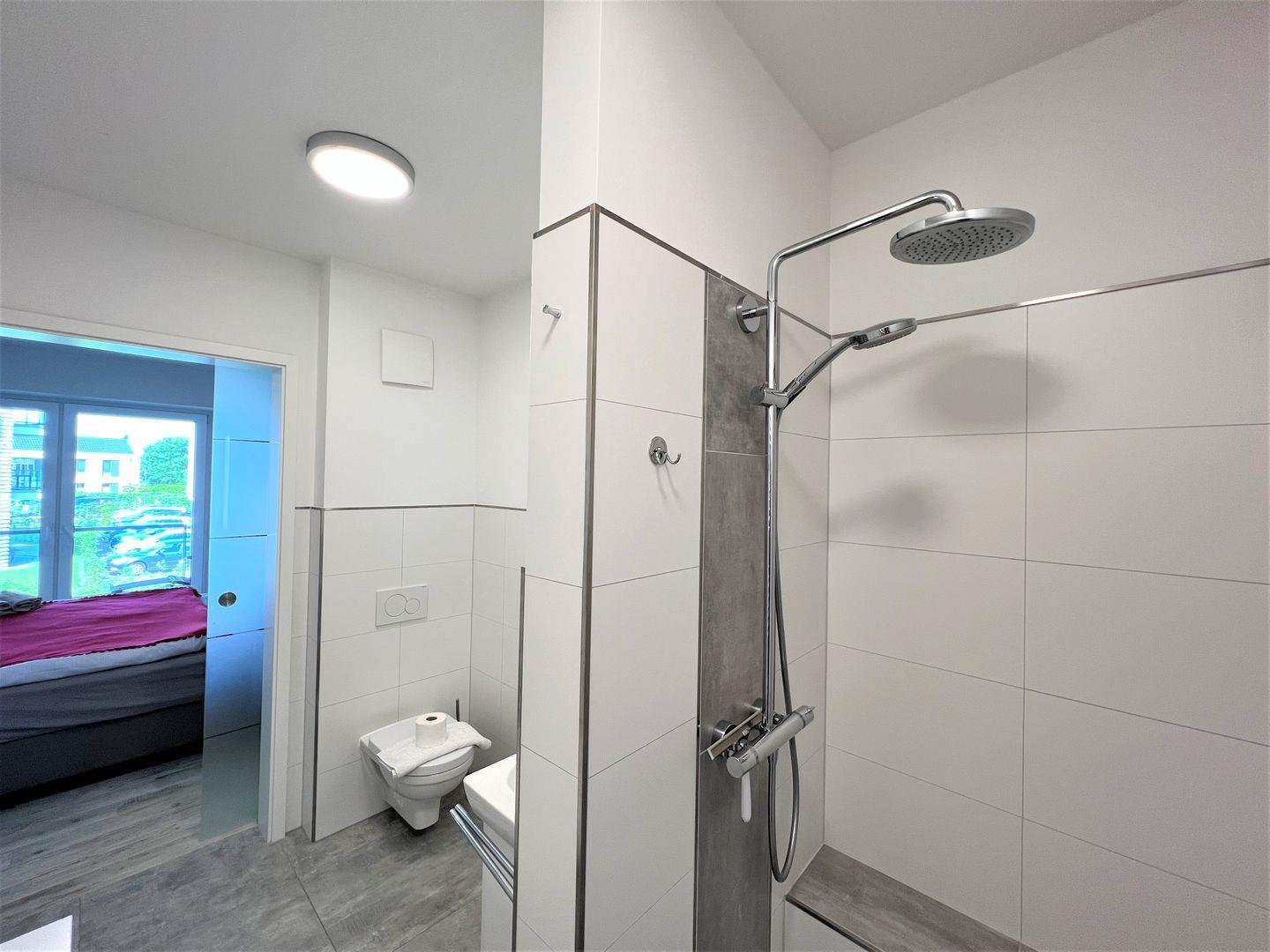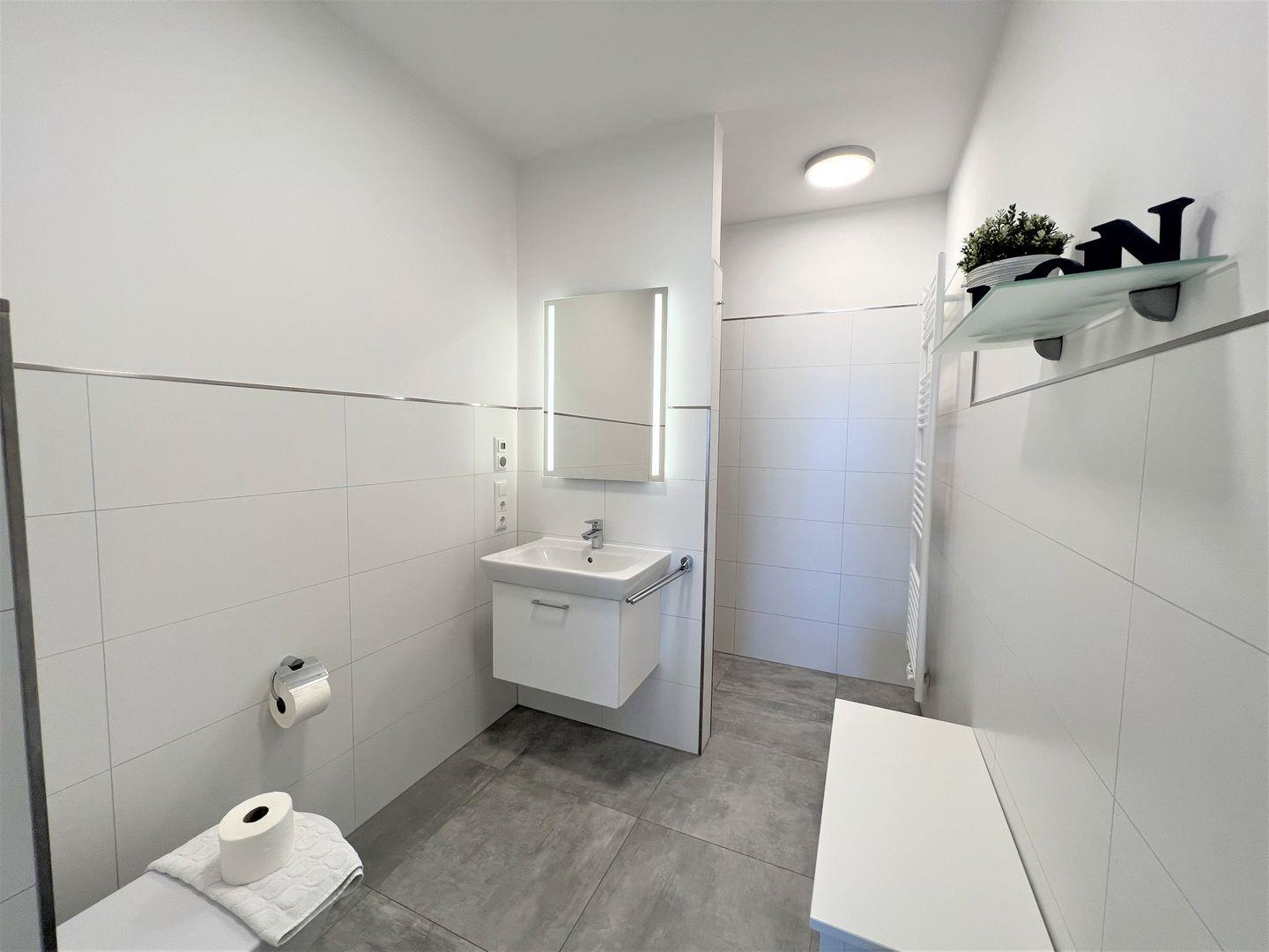 Vom Schlafzimmer geht es weiter zu Ihrem Duschbad mit WC, beleuchtetem Spiegel und begehbarer Sommerregendusche. Eine zusätzliche Ablagebank rundet das Angebot ab.