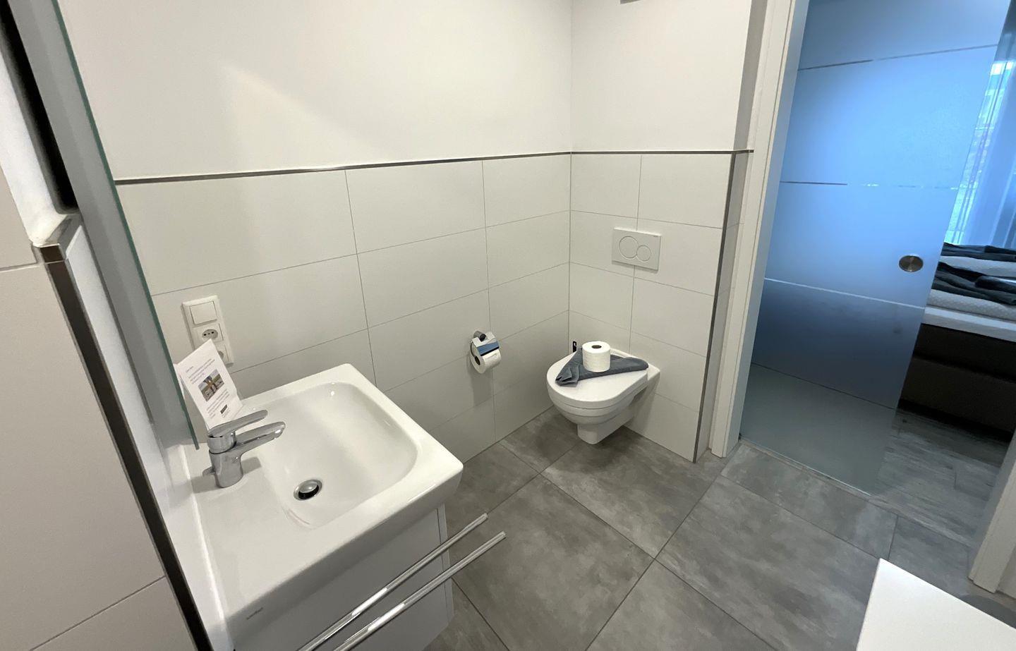 Vom Schlafzimmer geht es weiter zu Ihrem Duschbad mit WC, beleuchtetem Spiegel und begehbarer Sommerregendusche. Eine zusätzliche Ablagebank rundet das Angebot ab.
