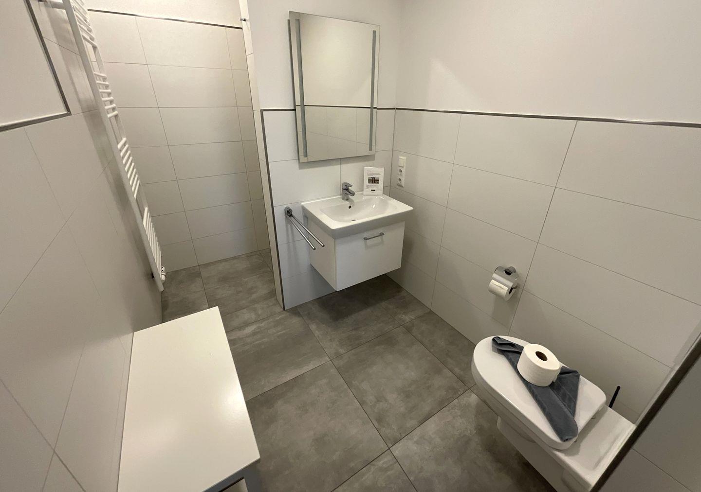 Bad und Sanitär: bodentiefe, barrierefreie Sommerregendusche, Waschtischanlage mit Spiegel, WC, Handtuchheizung, Föhn, Ablagebank, Handtücher auf Anfrage