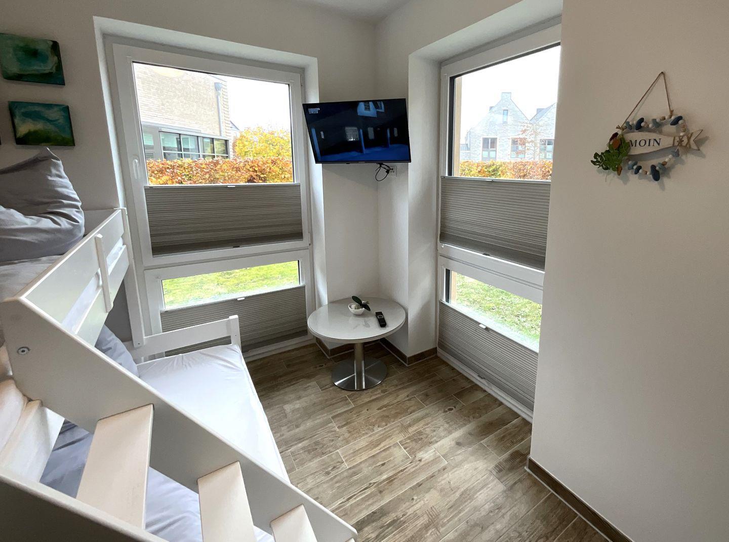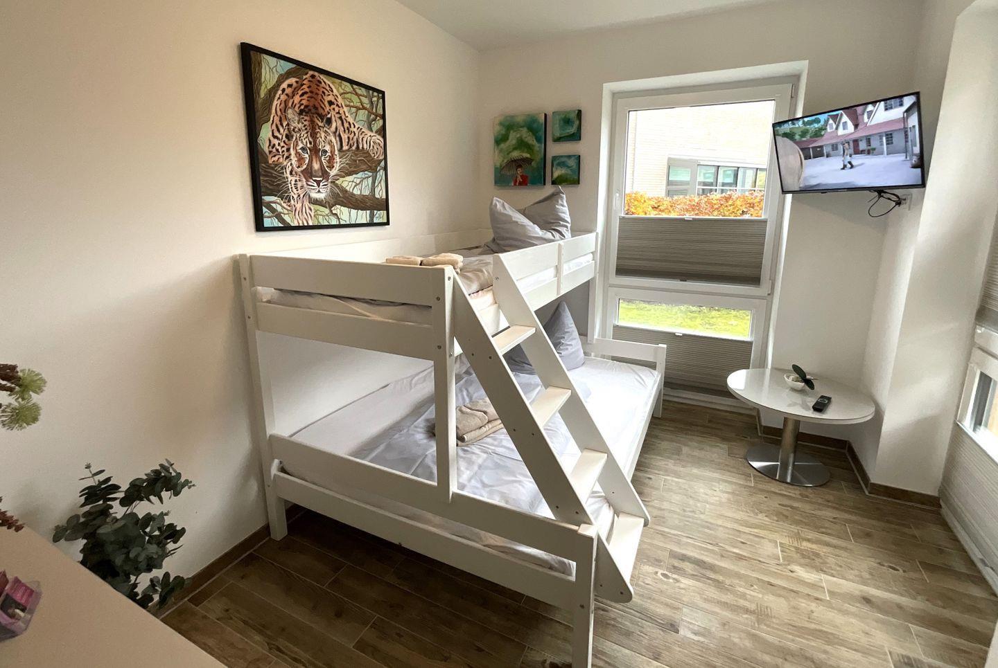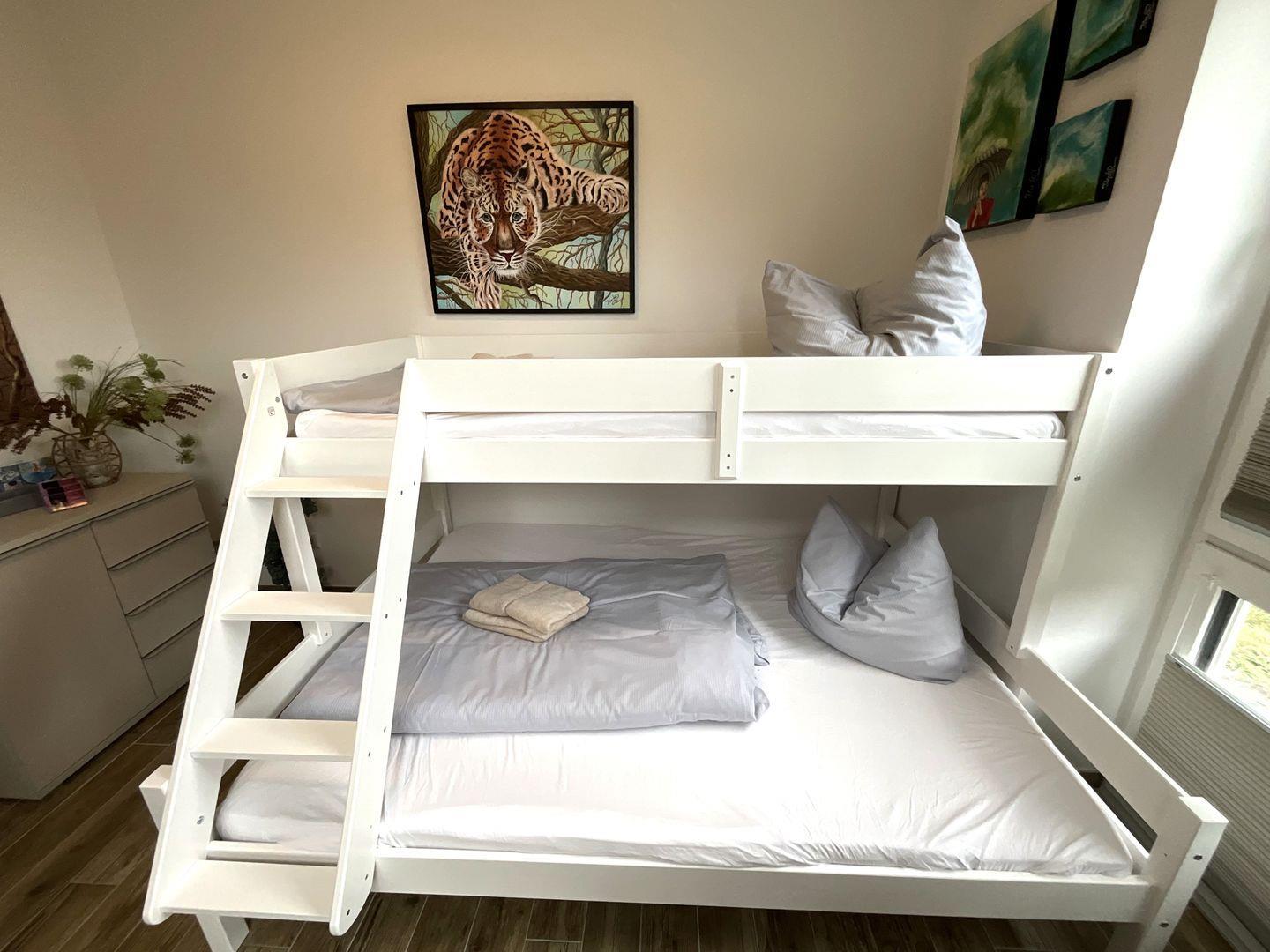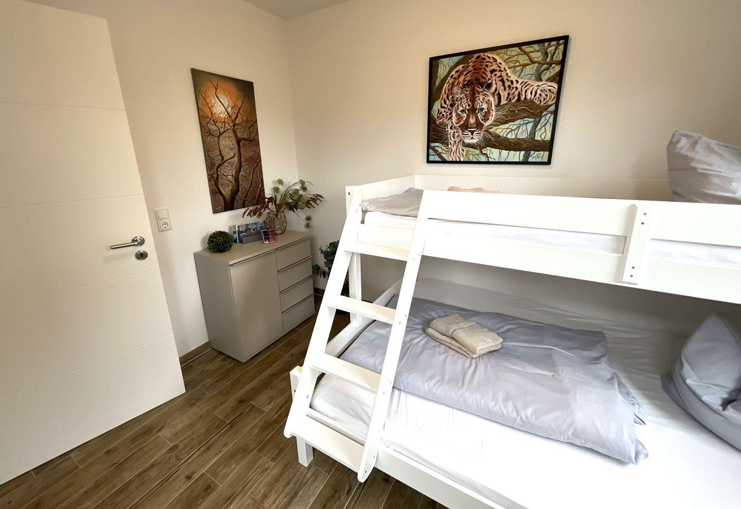 Das zweite Schlafzimmer ist mit einem Etagenbett ausgestattet, das untere Bett hat eine Liegefläche von 140x200 cm - das obere Bett ist 90x200 cm groß.