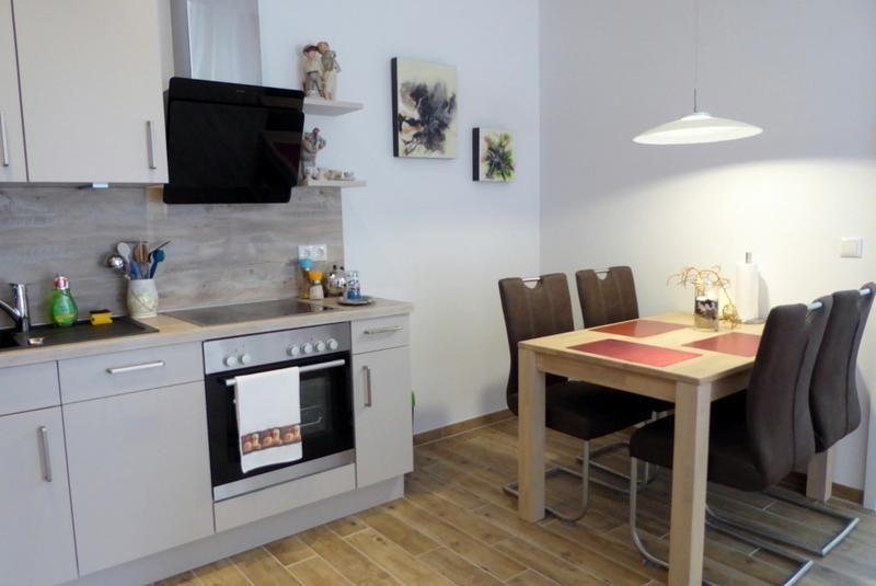 Küche: Backofen, 4-Zonen Cerankochfeld, Kühlschrank mit Gefrierfach, Dunstabzugshaube, Geschirrspüler, Toaster, Wasserkocher, Kaffeefiltermaschine, Geschirr, Esstisch mit 4 Schwingstühlen
