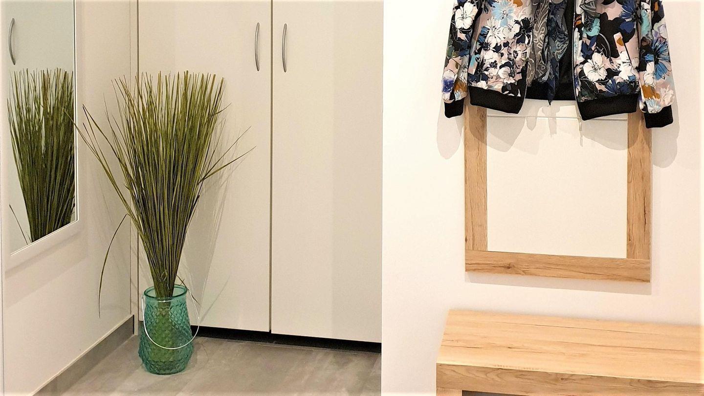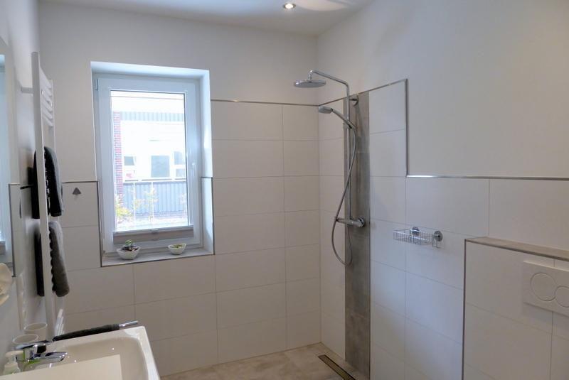 Vom Eingangsbereich mit praktischer Garderobe geht es in das stilvolle Duschbad mit Tageslicht und großer, begehbarer Sommerregendusche.