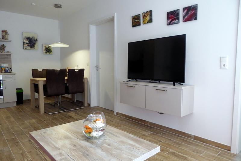 Wohnzimmer: Polstergarnitur, Sessel mit Drehfunktion, Flachbildfernseher, WLAN