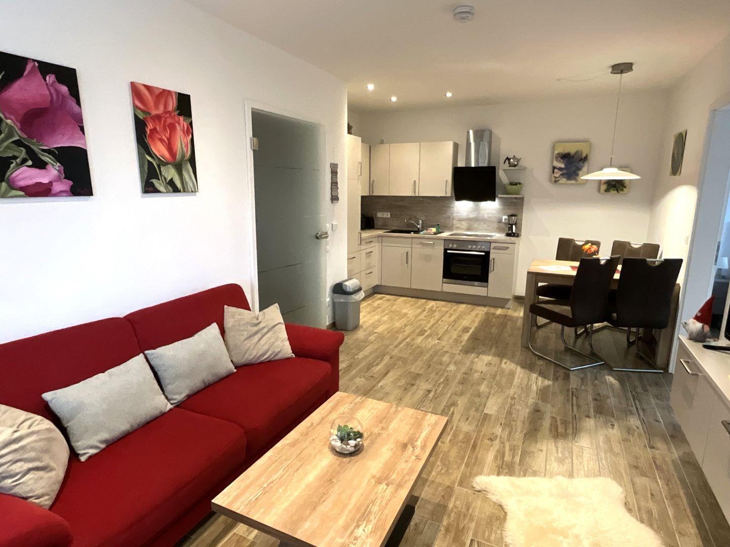 Das Herzstück des Apartments ist der Wohn-Essbereich mit voll ausgestatteter Küche, einem Esstisch mit 4 bequemen Schwingstühlen und dem Wohnzimmer. Das hochwertige rote Sofa lädt zum Verweilen ein.