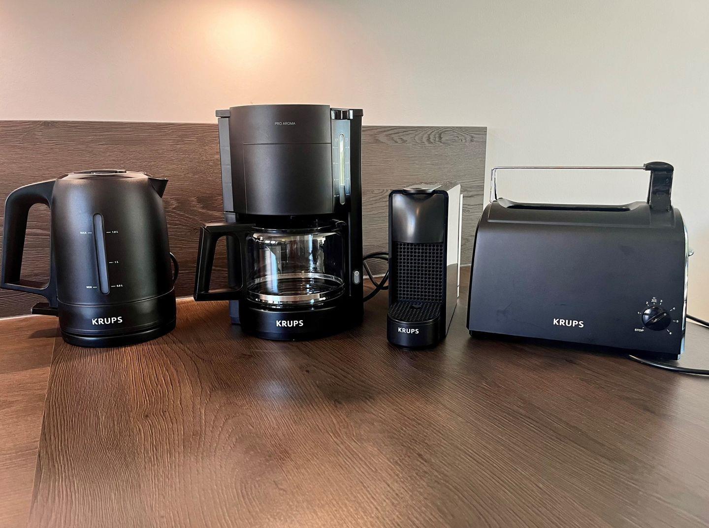 Küche und Haushalt: Einbauküche, Kühlschrank mit Gefrierfach, 4-Zonen Cerankochfeld, Backofen, Dunstabzugshaube, Mikrowelle, Geschirrspüler, Kaffeefiltermaschine + Kapselmaschine, Toaster, Wasserkocher, hochwertiges Geschirr und Besteck