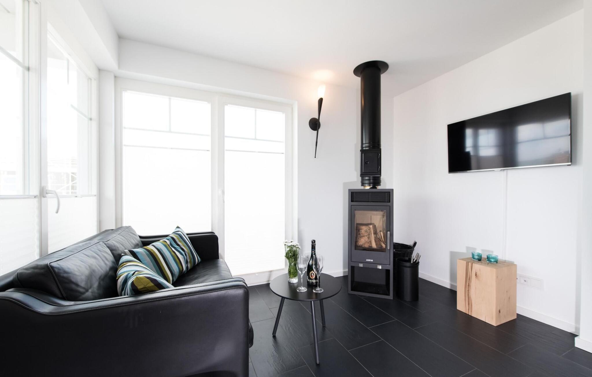Über den Dingen verweilen lässt es sich im Studio des zweiten Obergeschosses, einem zusätzlichen Wohnbereich mit phänomenalem Ausblick: Zur einen Seite Strand und weite Ostsee, zur anderen Seite der Hafen und die Schlei. Die umlaufende Dachterrasse lädt zum Sonnenbaden und romantischen Sonnenuntergängen ein. Ob mit Buch und Wein, bei einem spannenden Film oder romantisch vor dem knisternden Feuer des Kamins, das Studio stellt das Highlight der Strandvilla dar, denn hier lässt sich die Seele baumeln lassen.