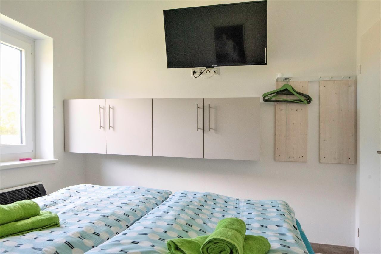 Do you know how beautiful it is on our sun terrace? You will find your personal and surprising answers to all these questions here with us, and please note that we also expressly allow dog owners to holiday with us. A holiday with a dog means: If there are no people in the holiday home, there is no dog in the house! Animals are not locked up in our holiday homes, but are always at the side of their owners. Children are very welcome here. Simply bring your extra bed with you if required. Please also pack a suitcase for your four-legged companions, as we do not provide any pet utensils. The sun terrace faces south-west and is equipped with garden furniture and an awning. The property is enclosed by a fence and is therefore also ideal for children. The fence height of 1 metre allows the dogs to run freely on the 200 m² property. You can park your car directly at the holiday home on the path and the ground floor, fully tiled bungalow is approx. 50m² in size. In the eat-in kitchen with fully equipped kitchen and dining area there is a two-seater made of leather. A mini oven, a ceramic hob, a filter coffee machine and a toaster are part of the kitchen equipment. In the bedroom you can relax on the extra high double bed (160X200) and dream sweet dreams. The bathroom has a modern walk-in shower and a window. Two satellite TVs and an internet radio with USB connection complete the technical equipment. Connect your mobile phone to the radio and you can listen to your music. Wi-Fi is available not only in the house but also throughout the property. In cold weather, a modern electric heater provides cosy warmth. Just pay us a visit! See for yourself!