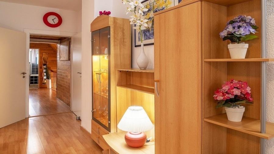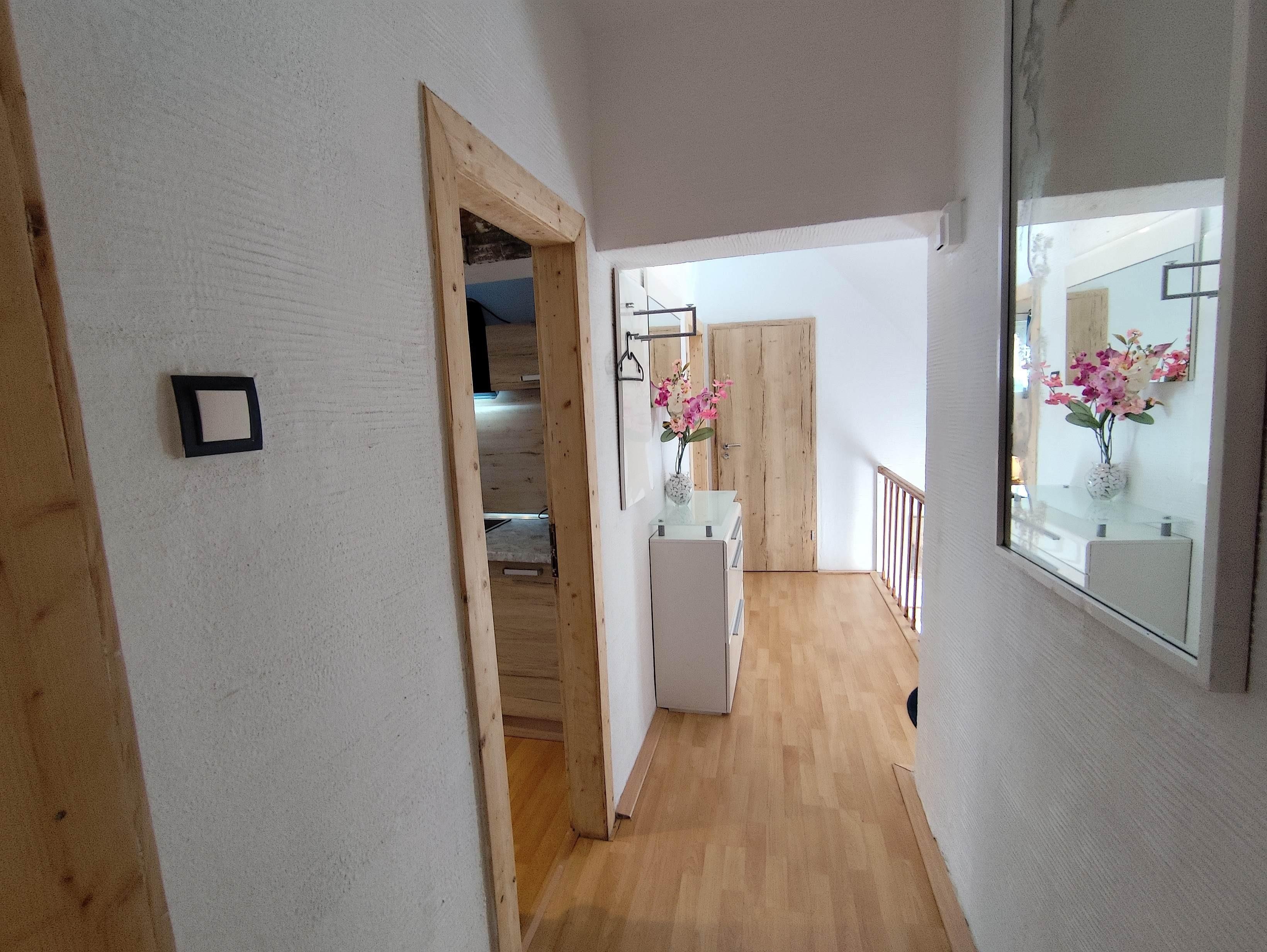 Ferienwohnung Daun: Die schöne Ferienwohnung ist neu renoviert und für 8 Personen geeignet, Größe auf 2 Etagen: ca. 95 qm. Sie liegt in der 1. und 2. Etage des City Ferienhauses Vulkaneifel (separater Eingang). Sie verfügt über einen Wohnraum mit mit Doppelschlafsofa, Sofaecke und Essecke, großer HD Fernseher mit vielen deutschen und internationalen Sendern (2 Satelliten, Astra und Hotbird)) mit DVD und Stereoanlage mit Radio, CD und USB, 3 separate Schlafzimmer mit großen Doppelbetten, ein Schlafraum befindet sich in einem apartmentähnlichen Raum im Obergeschoß (über Wendeltreppe erreichbar). Dort befindet sich zudem eine komplette Sofagarnitur, 2. HD Fernseher mit DVD und Stereoanlage mit Radio, CD und USB. Die Wohnung verfügt zudem über eine neue, separate Küche mit 4 Platten-Herd (Ceranfeld) und Backofen, Spülmaschine, Kühlschrank mit Gefrierfach und einer zusätzlichen Essecke in der Küche, Bad/DU/WC mit Badewanne und Duschvorrichtung, modernes Aufsatzwaschbecken, schöner LED Spiegel mit Uhrzeit, Hotelfön, HD TV und DVD und Stereoanlage mit Radio, CD und USB im Bad, schöne Holzdiele, Garderobe, Zentralheizung, Spiele. Eine Waschmaschine und Trockner befinden sich im Kellerbereich des Hauses. Diese Einrichtungen können gegen eine geringe Gebühr genutzt werden (4,50 € Waschen und Trocknen incl. Waschmittel).