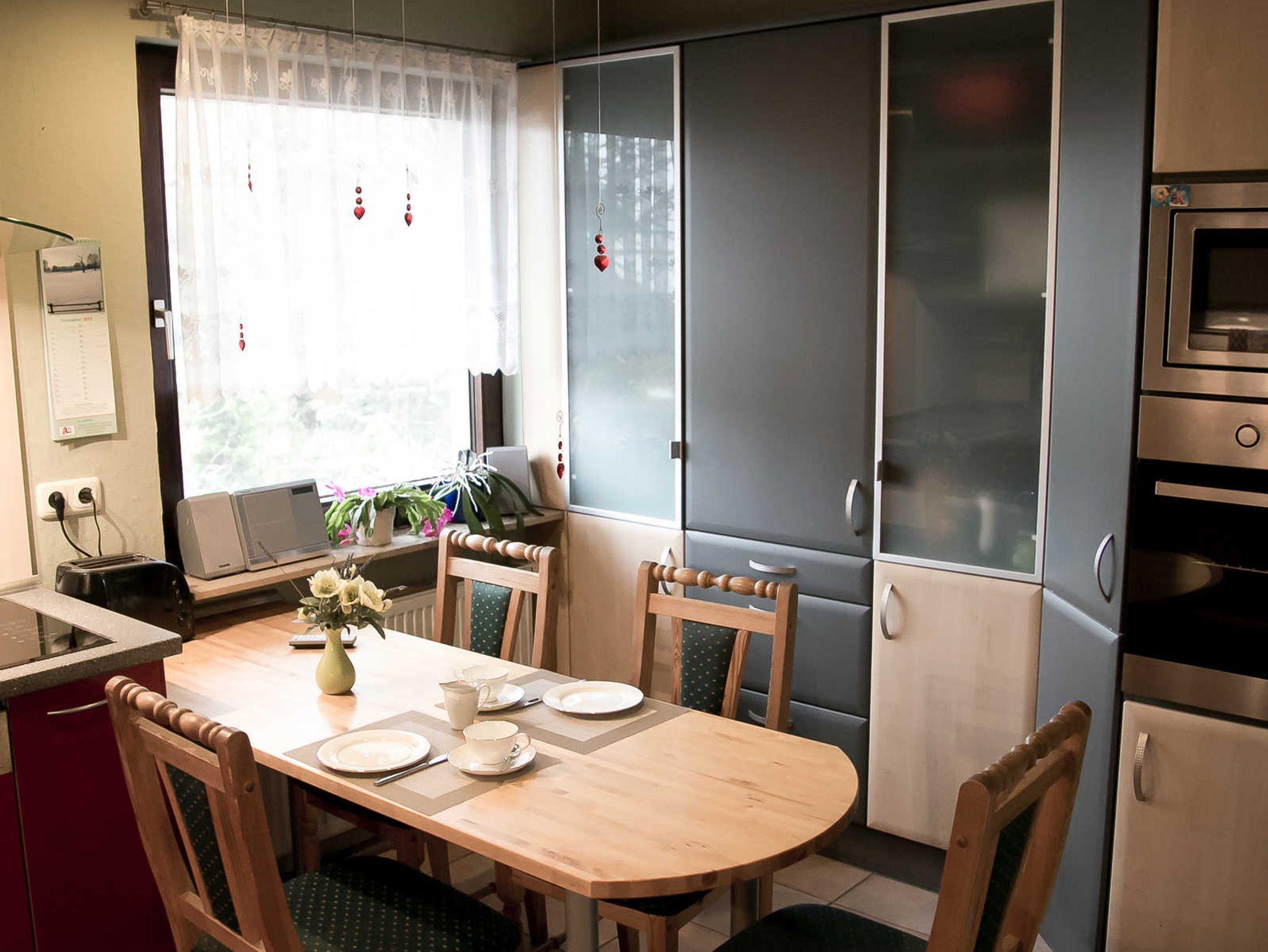 Die Wohnung ist entsprechend dieser Personenzahl mit Geschirr und weiteren Utensilien ausgestattet. Der Kamin verleiht Gemütlichkeit. In den weiteren Ferienwohnungen ist dann reichlich Platz für Schlafgäste. Da es im Objekt keinen allgemeinen Aufenthalts- oder Frühstücksraum gibt, wäre es günstig, wenn die Gäste vorrangig eine eigene Frühstücksversorgung übernehmen. In den vollausgestatteten Küchen sind immer Kaffee, Tee, Kondensmilch und selbstgemachte Marmelade vorhanden. Gern übernehme ich nach Absprache einen entsprechenden Einkaufsservice, um fehlende Dinge entsprechend Ihrer Wünsche bereit zu stellen.