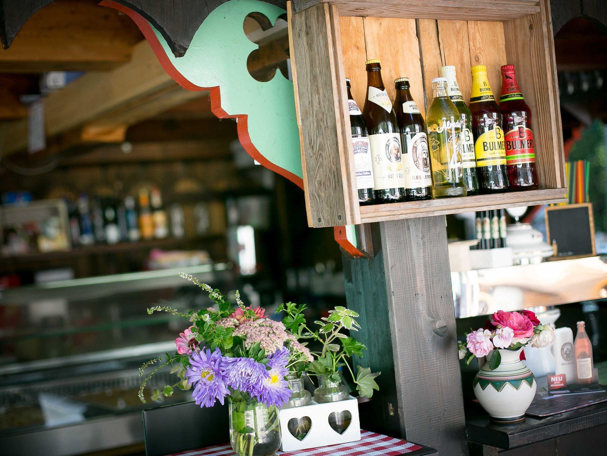 Zimmer mit Doppelbett, Babybett optional aufstellbar. Blick auf Biergarten und Wald.