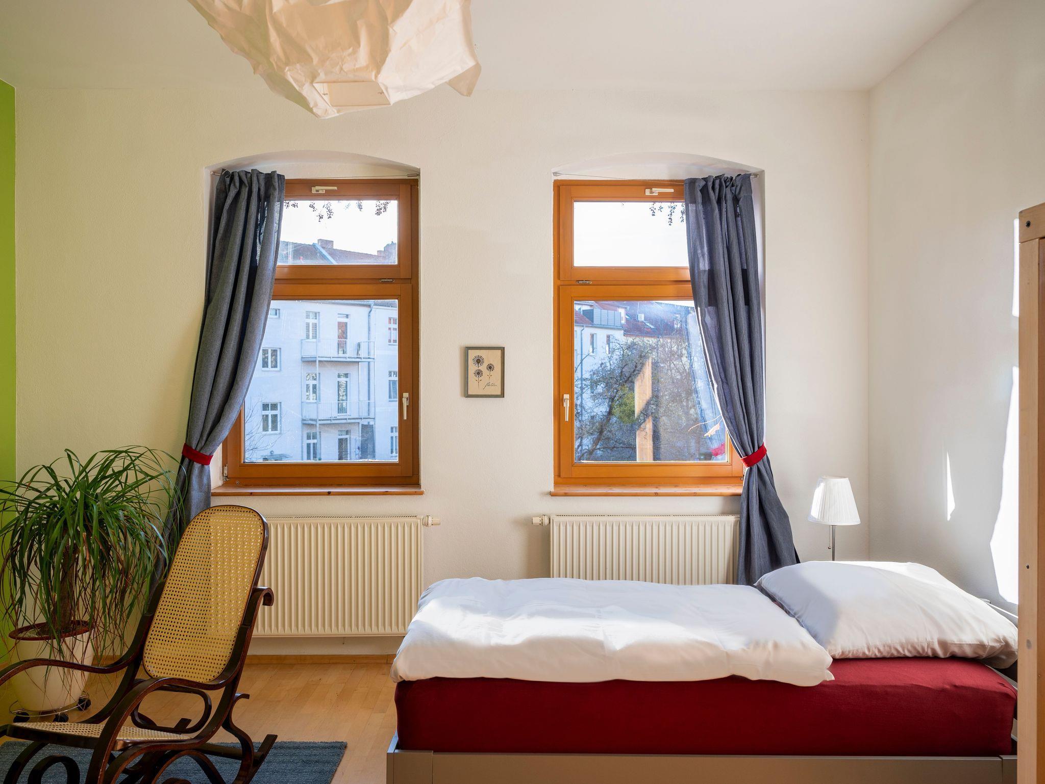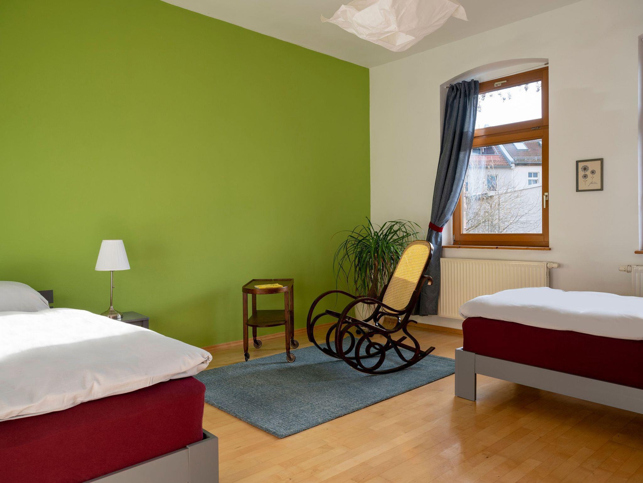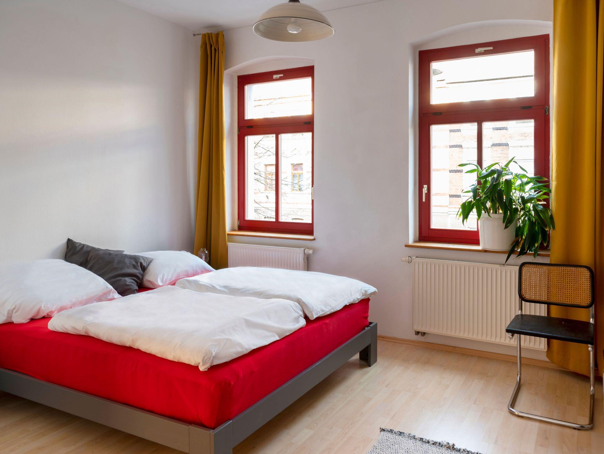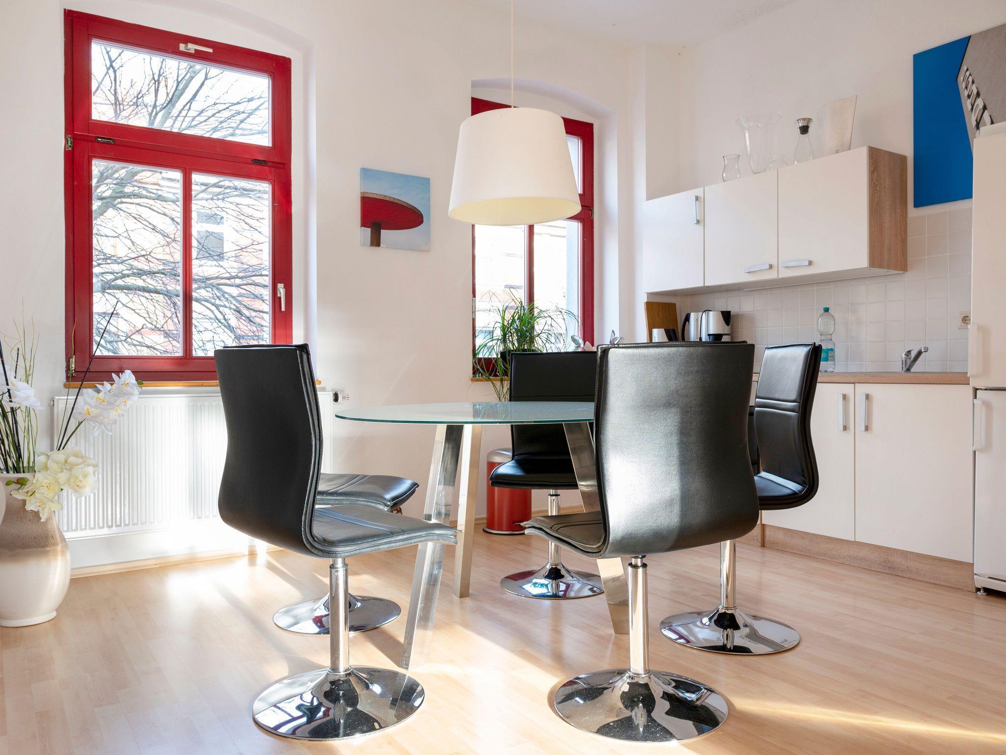 Die geräumige Ferienwohnung im Gründerzeitviertel umfasst mit zwei Schlafzimmern, Wohnzimmer und Küche mit Essbereich das gesamte 1. Obergeschoss. Das Wohnzimmer ist auch als drittes Schlafzimmer buchbar. Die Küche ist mit Herd, Backofen, Kühlschrank mit Gefrierteil, Wasserkocher und KaffeemaschineHerd, Backofen, Kühlschrank mit Gefrierteil, Wasserkocher und Kaffeemaschine ausgestattet.