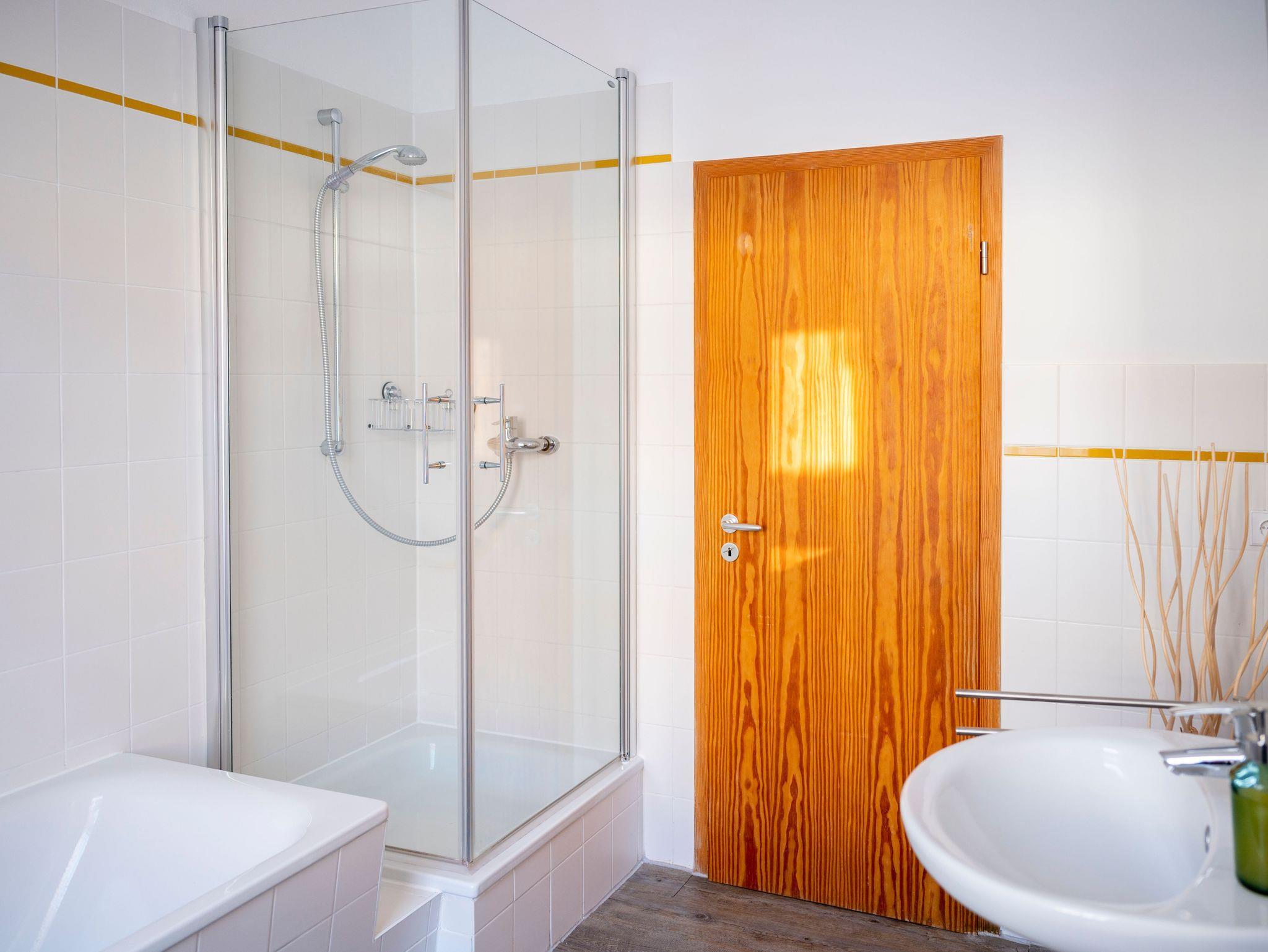 Die Ferienwohnung umfasst das gesamte 1. Obergeschoss. Durch die Eingangstür wird ein kleiner Flur betreten, der offen in den Essbereich für bis zu sechs Personen führt. Hier ist auch die Küchenzeile mit Herd, Backofen, Kühlschrank mit Gefrierteil, Wasserkocher und Kaffeemaschine zu finden. Vom Esszimmer aus ist das Wohnzimmer zu erreichen, welches auch als Doppelzimmer nutzbar ist. Hier steht eine kleine Literaturauswahl und der Flachbild-TV zur Unterhaltung zur Verfügung, eine Auswahl an Spielen ist im Esszimmer zu finden. Über den Flur sind die zwei Schlafräume und das Bad zu erreichen. Ein Schlafzimmer ist mit Doppelbett und Spiegelschrank ausgestattet., das zweite Schlafzimmer hat zwei Einzelbetten einen Schrank und einen Schaukelstuhl. Alle Betten haben extradicke und sehr bequeme Matratzen. Im Bad finden Sie eine Badewanne mit Duschmöglichkeit und eine separate Duschkabine, ein Waschbecken und ein WC. Das W-LAN ist in der gesamten Ferienwohnung nutzbar.