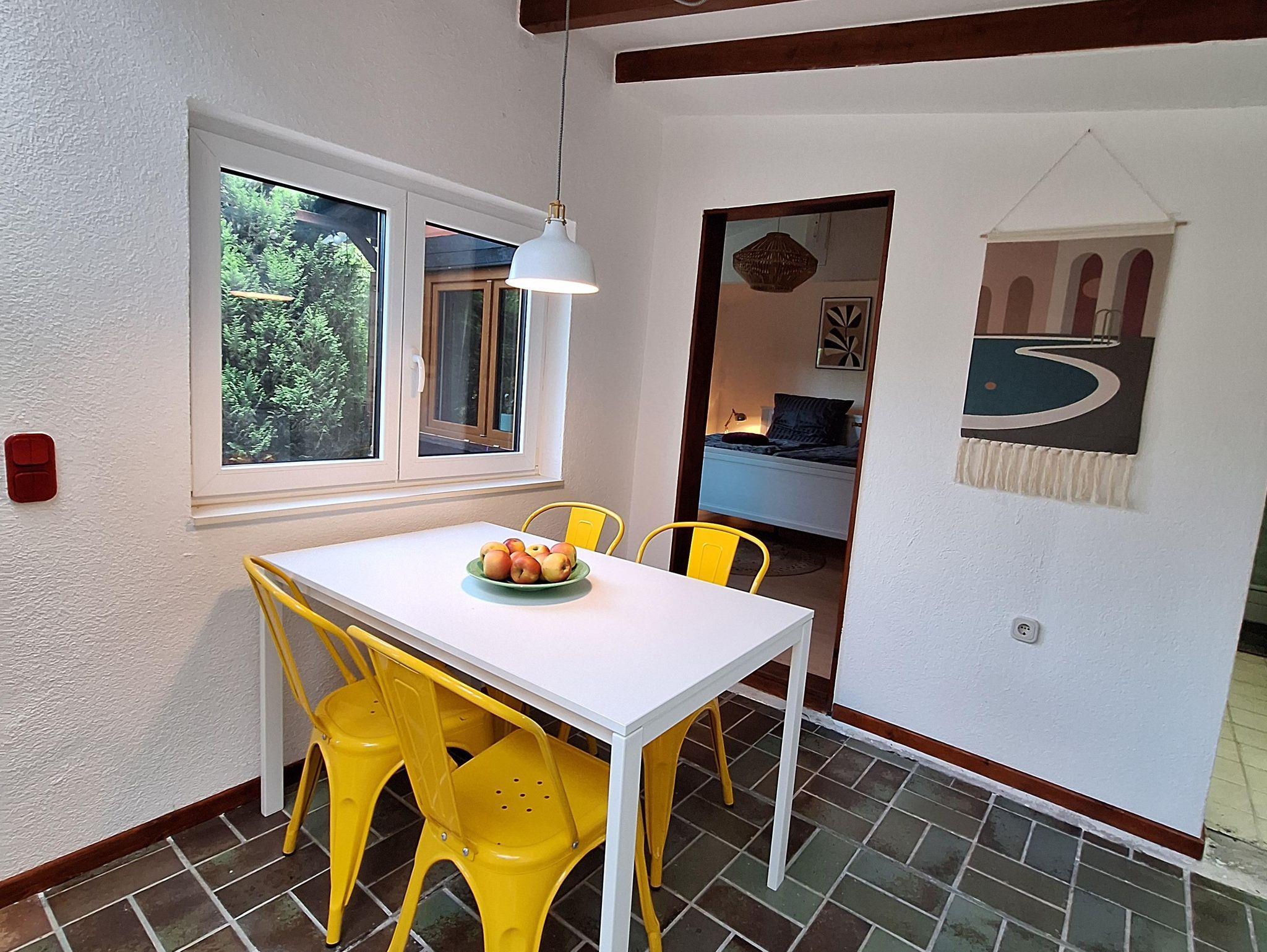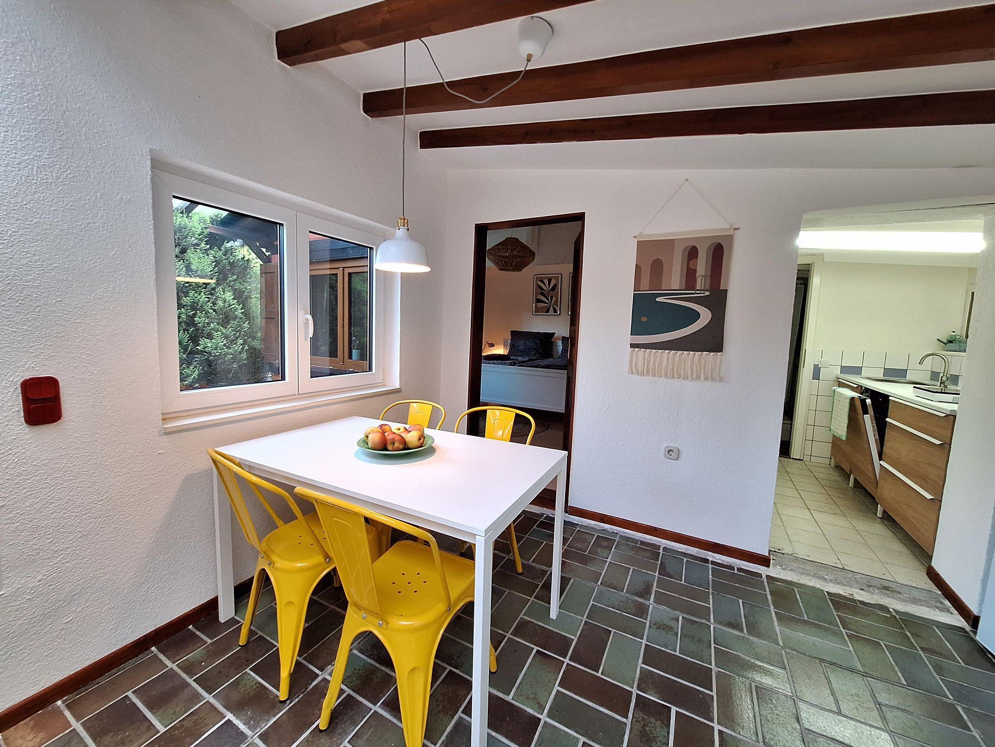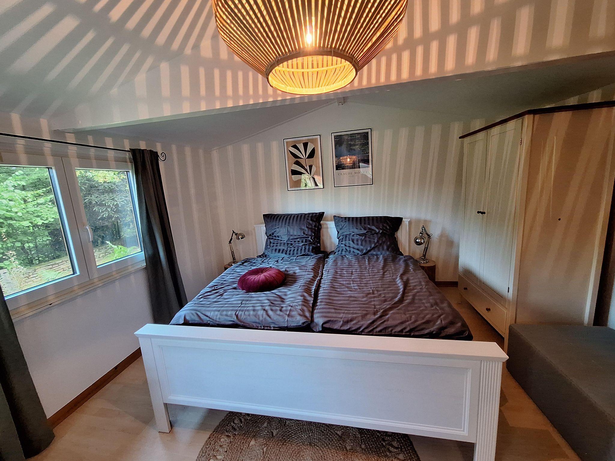 Das Chalet ist mit einem hellen Wohnzimmer mit gemütlicher Sitzgarnitur, SAT-TV, Radiorecorder, Spiele sowie dem direkten Zugang zum Garten eingerichtet und hat einen separaten Eingang. Im Wohnbereich befindet sich die Schlafmöglichkeit für die 3. & 4. Person. Die Küchenzeile ist gut ausgestattet unter anderem mit Kühlschrank, 2-Platten-Ceranfeld, Geschirrspüler, Senseo-Kaffeemaschine, Toaster, Wasserkocher, Mikrowelle. Zudem verfügt es über einen separaten Schlafbereich mit einem Doppelbett (1.80m x 2,00m). Vom Essplatz aus genießen Sie schon beim Frühstück einen herrlichen Ausblick ins Grüne. Der Gartenbereich mit Teich, und überdachter Veranda machen Ihren Aufenthalt am Tage und auch abends zu einem naturnahen entspannenden Erlebnis. Von verschiedenen Sitzplätzen aus erschließt sich ihnen immer wieder eine andere Perspektive ins Grüne.