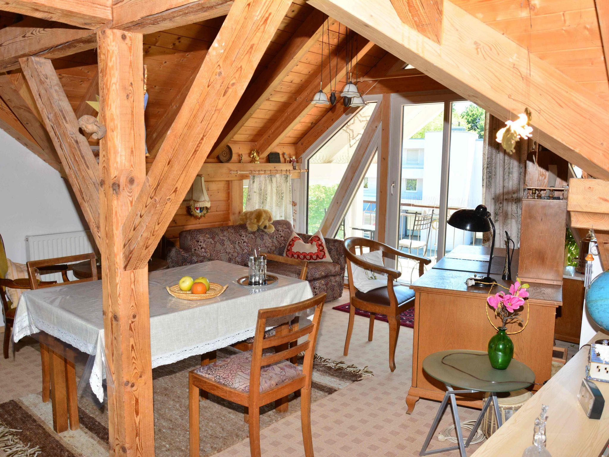 Die Ferienwohnung (ca. 75 qm) befindet sich im Dachgeschoß eines 2-Familienhauses. Sie besteht aus einem sehr großen, schön eingerichteten Wohn-/Arbeits- + Kochbereich. Der Kochbereich besteht aus einem 2 Plattenherd, Kühlschrank, Mikrowelle, Kaffeemaschine, Wasserkocher und Toaster. Im Wohn-Arbeitsbereich befinden sich eine Sitzecke mit Fernseher, eine weitere Sitzecke mit ausziehbarer Couch und einem Schreibtisch, 2 große Regale mit Büchern, die man auch lesen darf. Im Schlafzimmer befinden sich 2 Einzelbetten, Nachtkästchen und Kleiderschrank. Das Badezimmer verfügt über eine Badewanne, WC, Föhn und Waschbecken. Bettwäsche und Handtücher sind vorhanden. W-Lan und Parkplatz können kostenfrei genutzt werden.