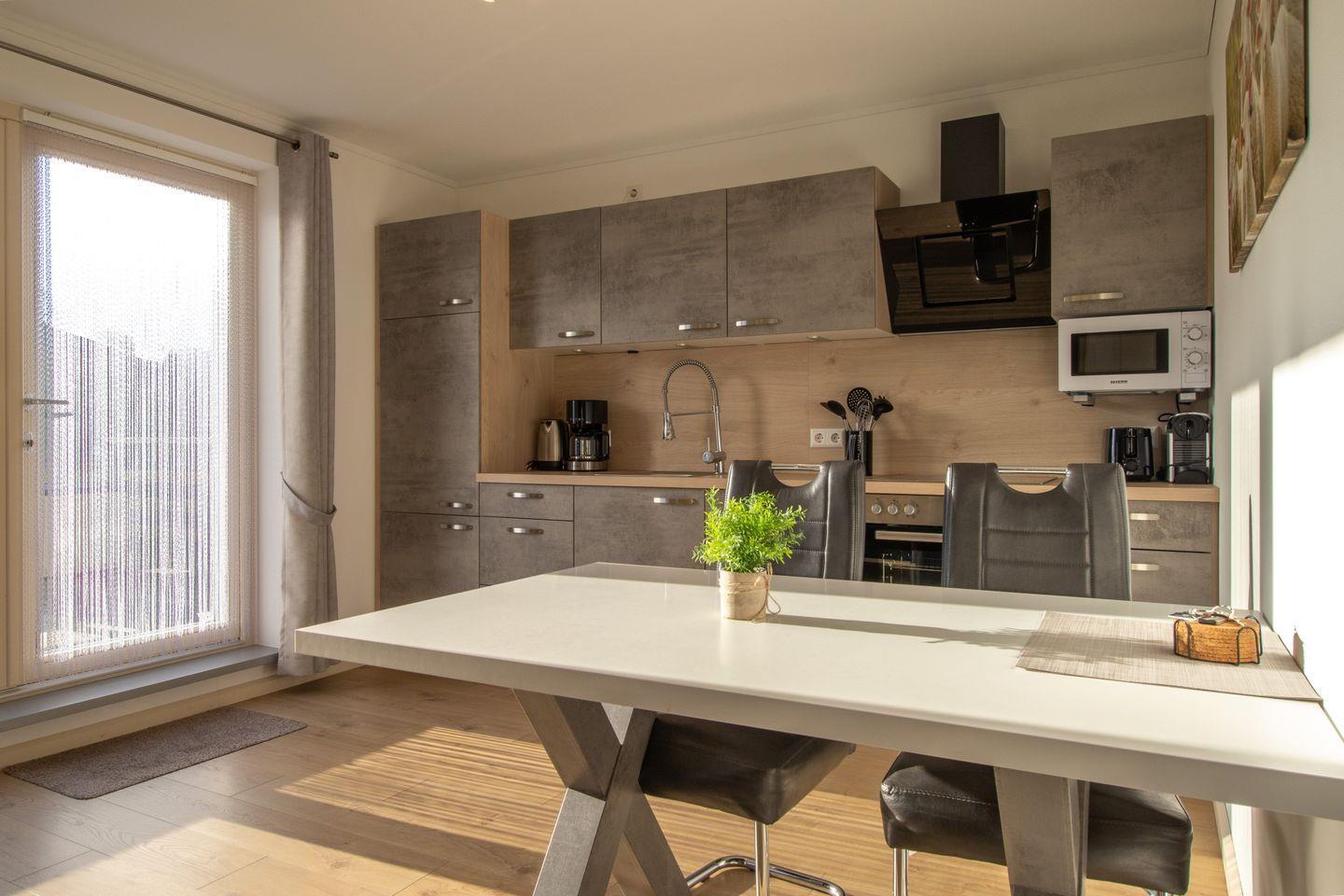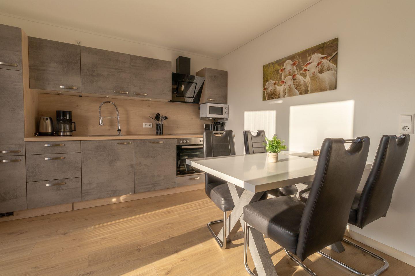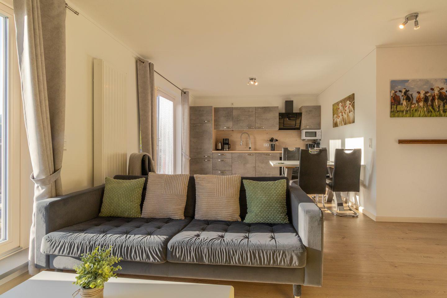Der helle Wohnbereich lädt mit Sofa und TV zum Entspannen ein. Die offene Küche ist komplett ausgestattet und bietet einen gemütlichen Essplatz für gemeinsame Mahlzeiten. Der große Balkon ist ein echtes Highlight – perfekt für sonnige Frühstücke oder lauschige Grillabende mit dem Elektrogrill.