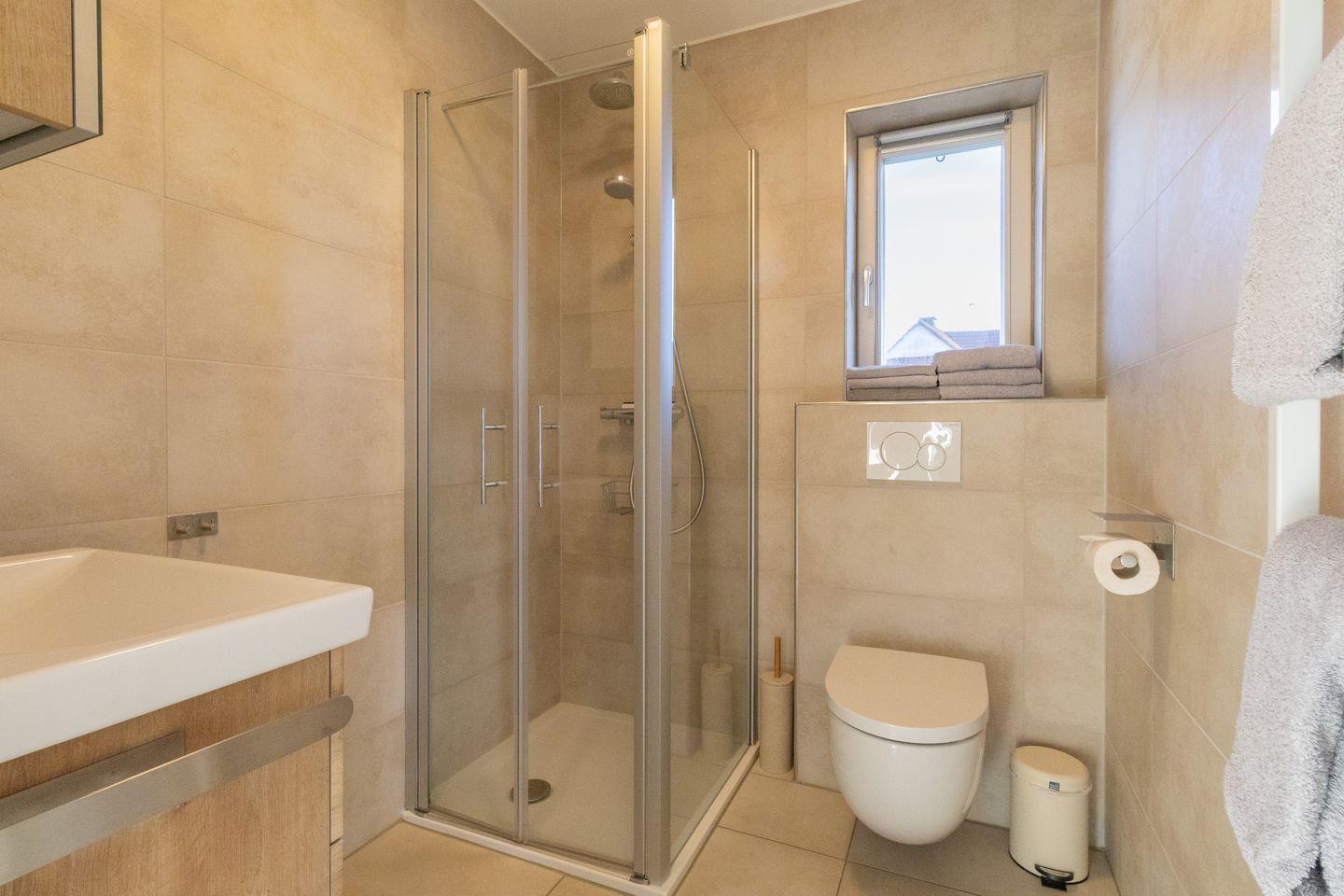 Das moderne Badezimmer ist mit Dusche, WC und Waschbecken ausgestattet. Helle Fliesen, stilvolle Einrichtung und die angenehme Fußbodenheizung sorgen für echtes Wohlfühlambiente – auch an kühleren Tagen.