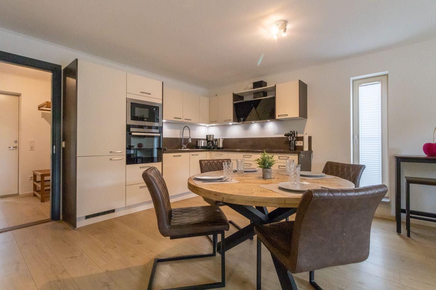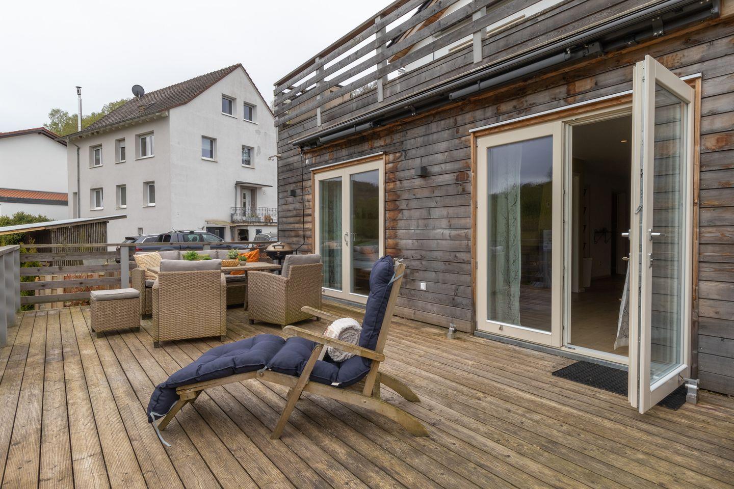 Der lichtdurchflutete Wohnbereich lädt mit bequemer Sitzecke und TV zum Entspannen ein. Die offene Küche ist vollständig ausgestattet und bietet alles für gemeinsame Kochmomente. Am angrenzenden Essplatz genießt ihr eure Mahlzeiten mit Blick in den Garten. Die große Terrasse mit Gartenmöbeln, Liegen und Elektrogrill ist wie gemacht für Sonnenstunden und gemütliche Abende.