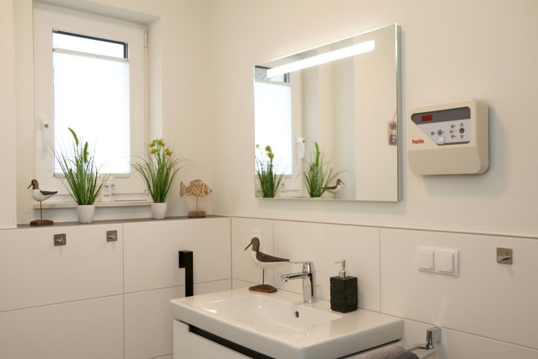 Im Obergeschoss erwartet dich ein modernes Badezimmer mit bodentiefer Dusche und privater Sauna – dein persönlicher Wellnessbereich für entspannte Stunden nach einem Tag in der Natur.