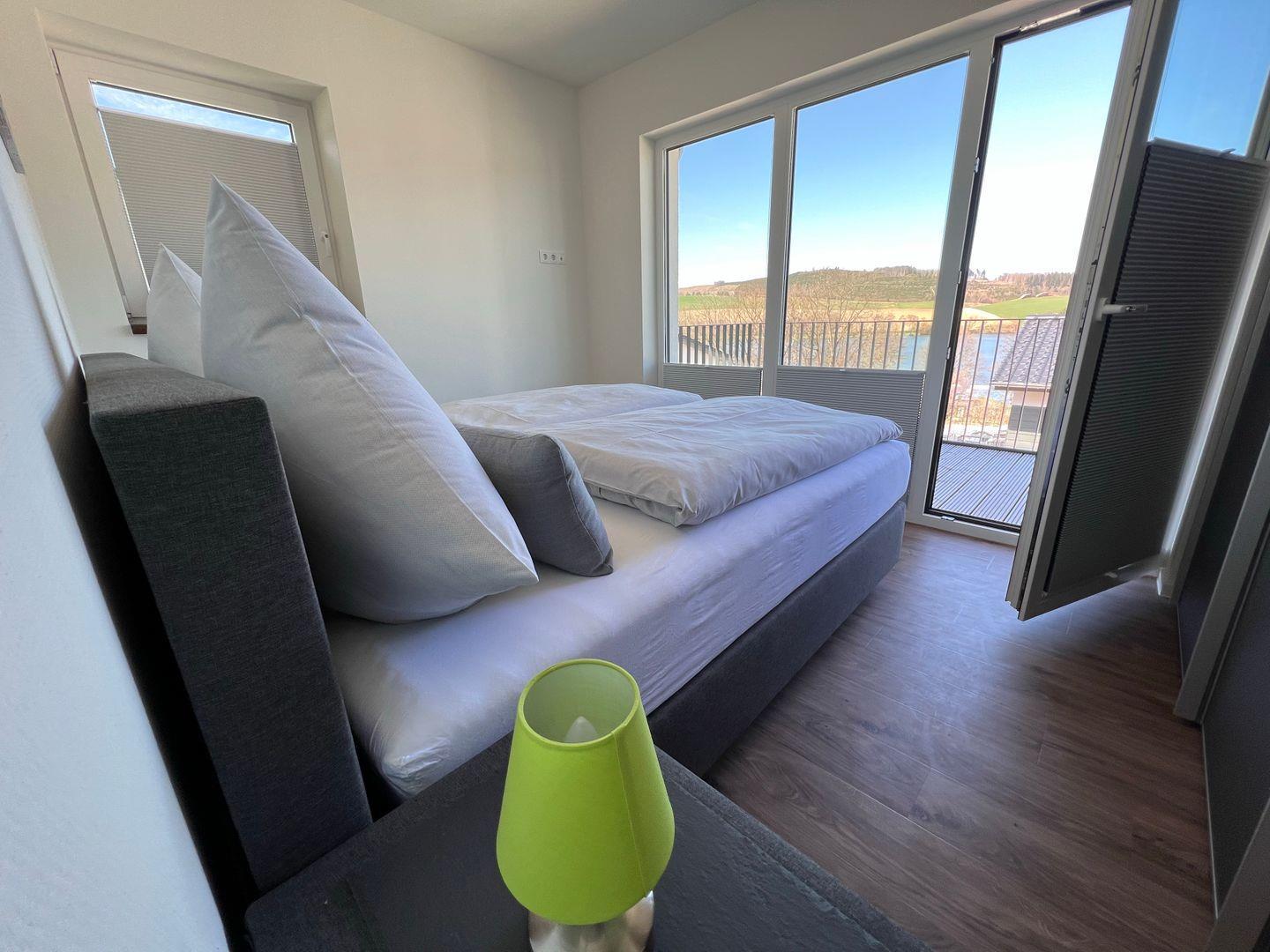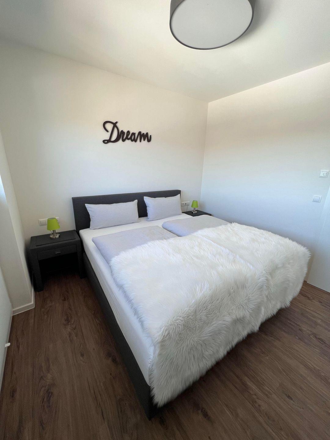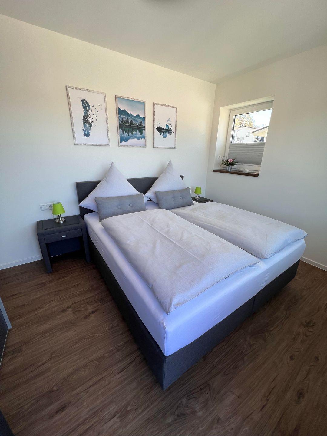 Zwei Schlafzimmer mit komfortablen Boxspringbetten und Verdunkelungsplissees sorgen für erholsamen Schlaf. Besonders schön ist das Schlafzimmer im Obergeschoss mit bodentiefen Fenstern und herrlichem Blick auf den See – hier kannst du den Tag mit Aussicht beginnen.