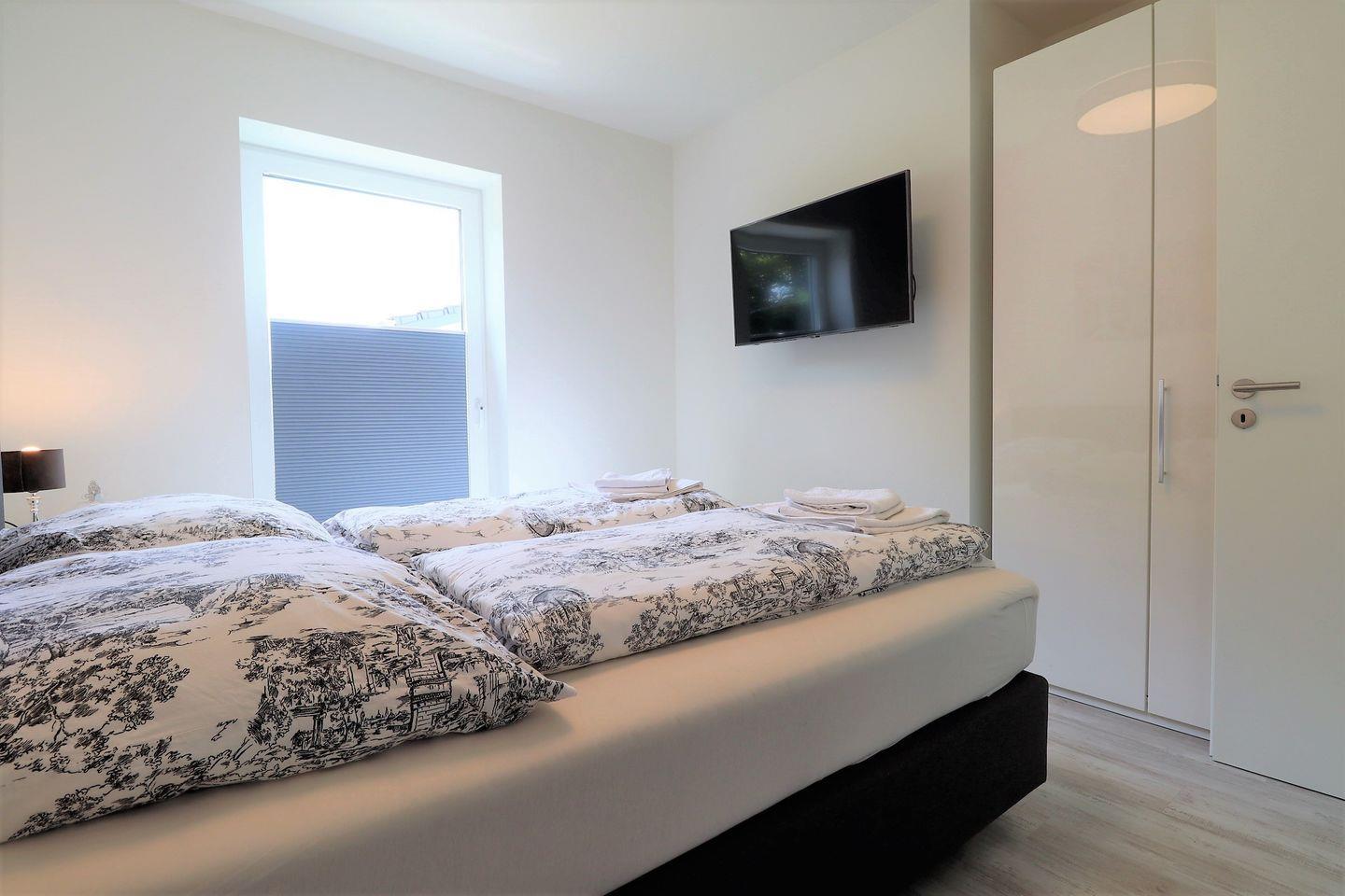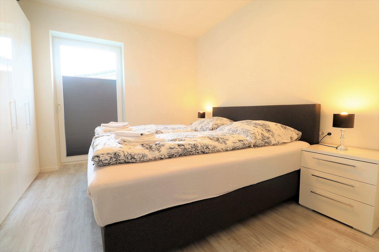 Zwei liebevoll eingerichtete Schlafzimmer versprechen erholsame Nächte. Im ersten Schlafzimmer schläfst du in einem hochwertigen Boxspringbett, ergänzt durch einen geräumigen Kleiderschrank und viel Tageslicht. Das zweite Schlafzimmer ist mit einem bequemen Doppelbett und ebenfalls einem Kleiderschrank ausgestattet – ideal für ruhige Stunden nach einem aktiven Tag.