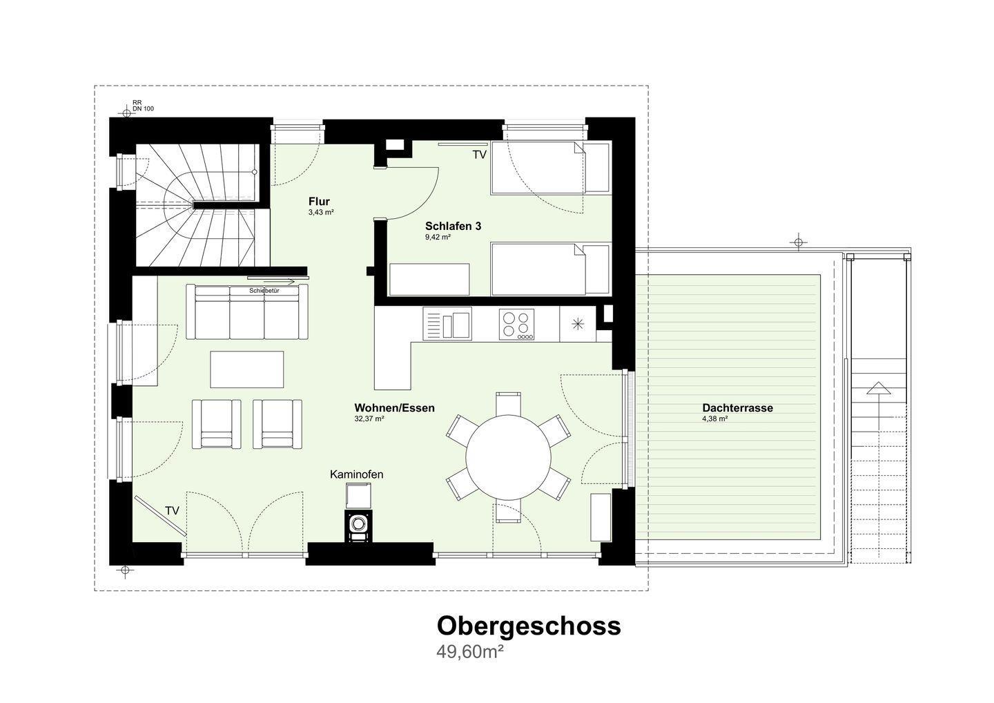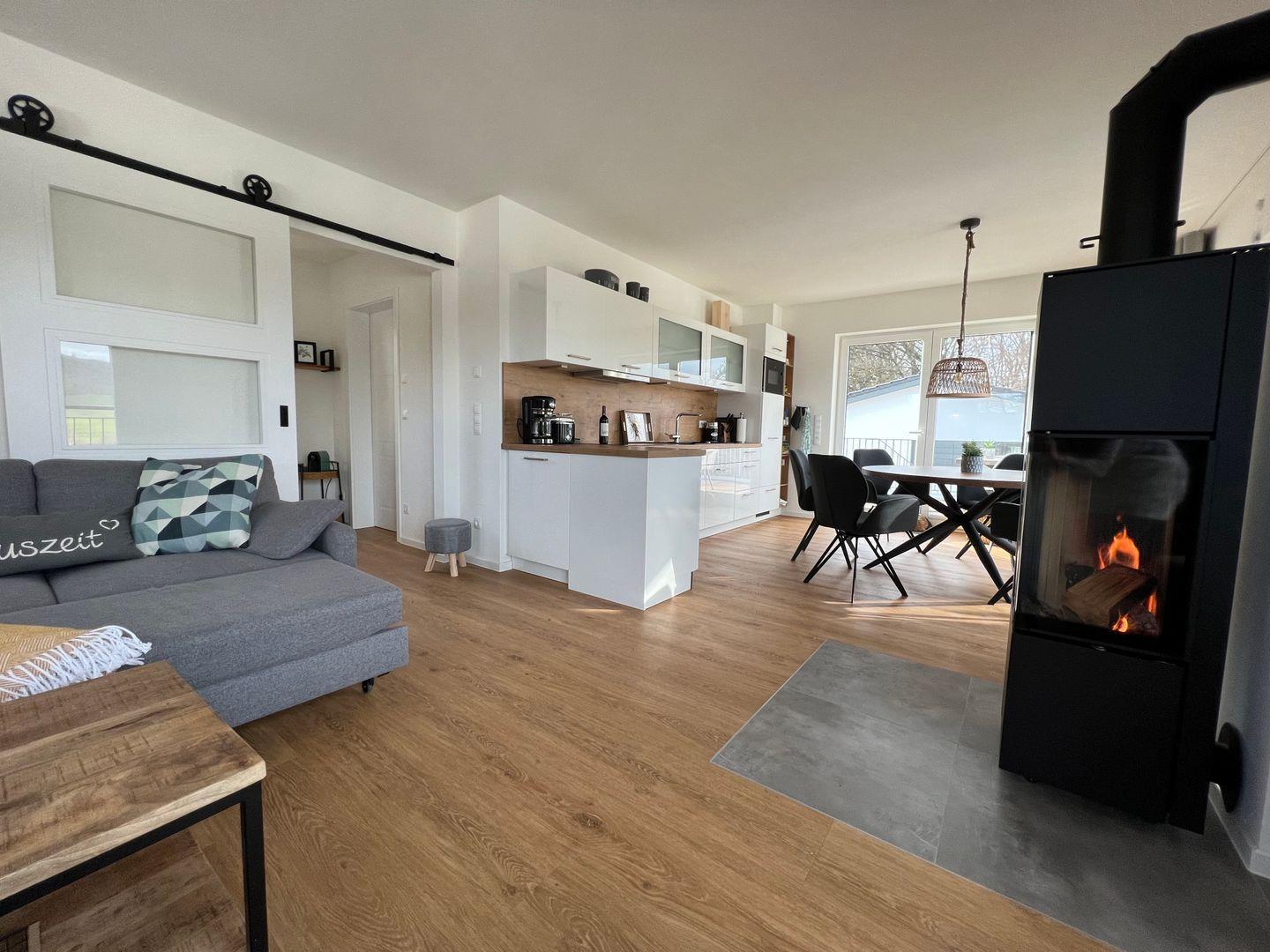 Der helle Wohn- und Essbereich mit Kaminofen und direktem Zugang zum Balkon lädt zum Verweilen ein. Bodentiefe Fenster sorgen für Panorama-Ausblicke, die moderne Küche bietet alles, was du brauchst – inklusive Mikrowelle, Mixer, Kapselmaschine und Sandwichtoaster. Spiele, Bücher, ein internetfähiger TV und bequeme Sitzmöbel sorgen für entspannte Stunden mit der Familie. Das Sofa im Wohnbereich lässt sich bei Bedarf zur Schlafcouch umfunktionieren.