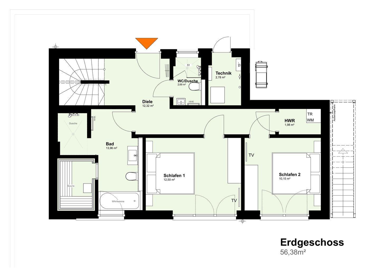 Das Masterbad im Obergeschoss ist deine private Wellnessoase: Whirlpool-Wanne, bodentiefe Dusche, Sauna, Föhn und Kosmetikspiegel sorgen für perfekte Wohlfühlmomente. Ein zweites Bad mit Dusche und WC bietet zusätzlichen Komfort.