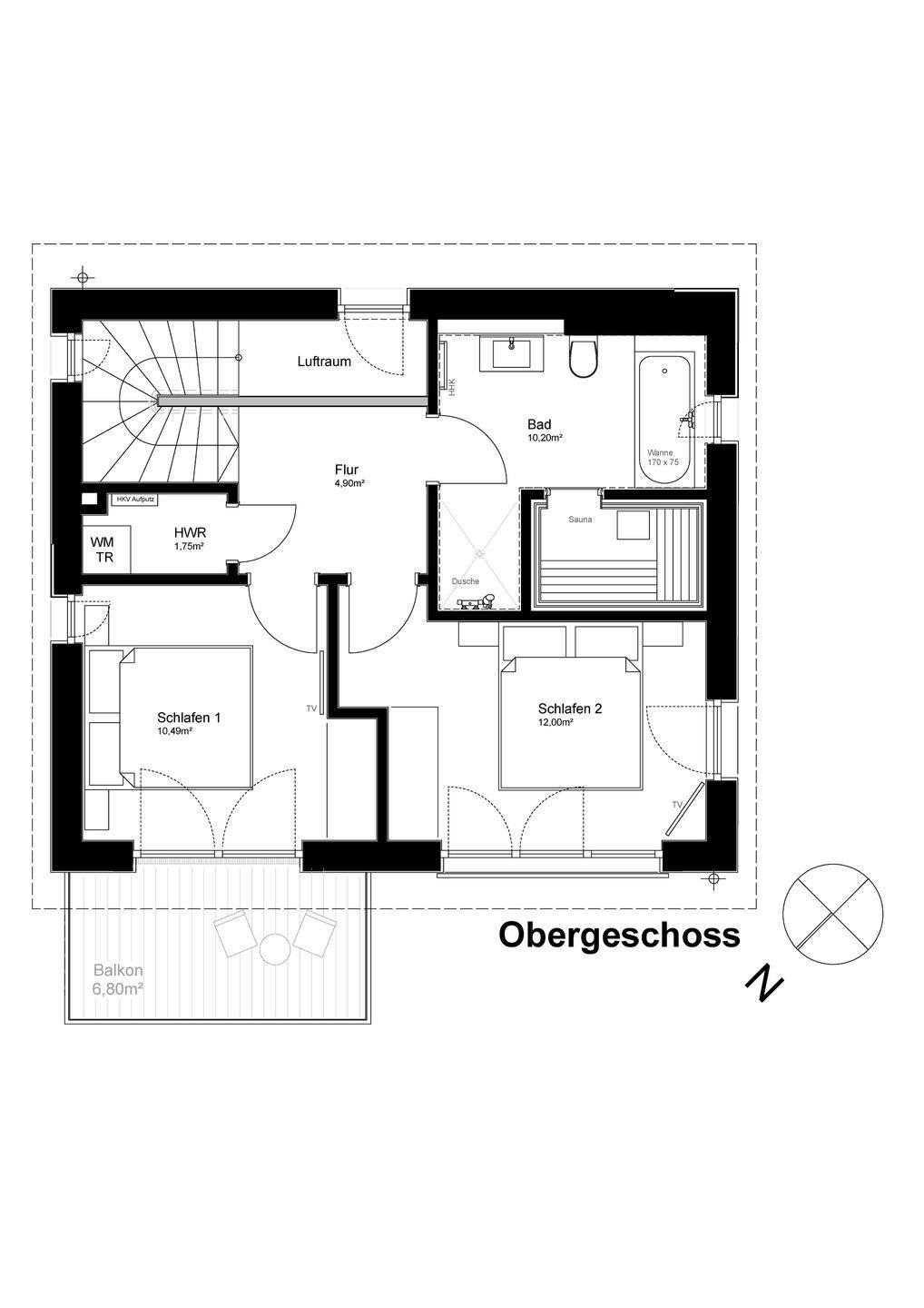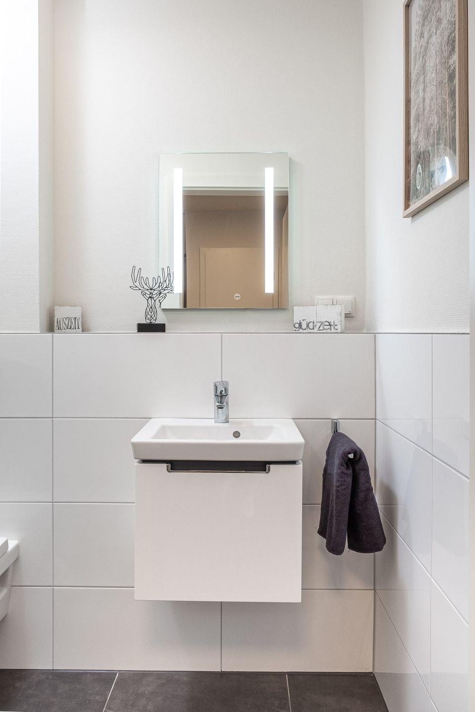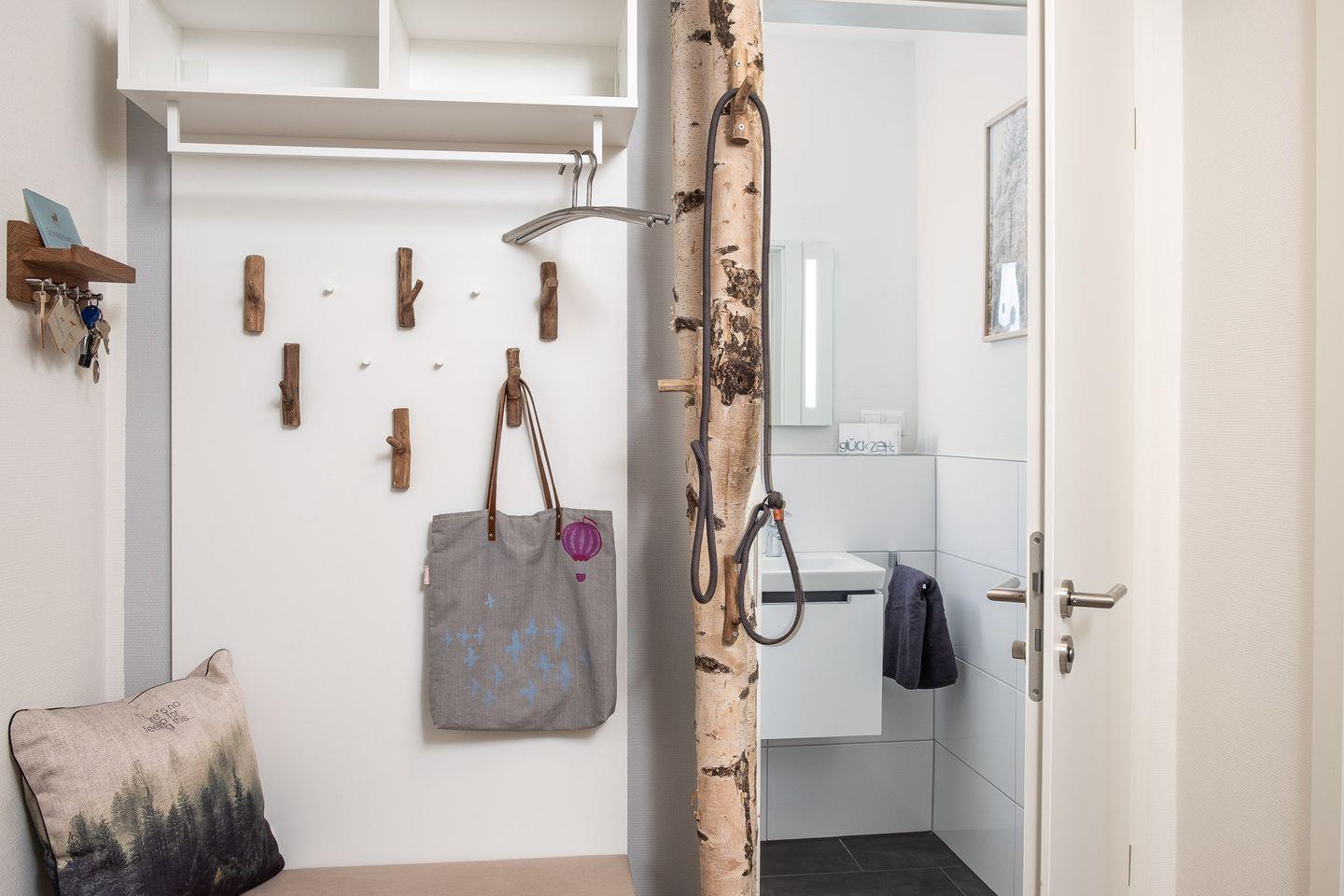 Nach einem aktiven Tag wartet deine private Wellnessoase: Das Bad im Obergeschoss verfügt über eine Sauna, Badewanne, bodentiefe Dusche, WC sowie Kosmetikspiegel und Föhn. Ein zusätzliches Gäste-WC befindet sich im Erdgeschoss.