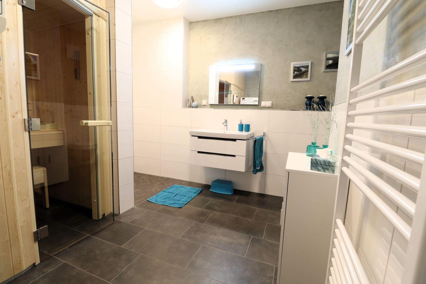 Das moderne Tageslichtbad ist mit einer ebenerdigen Dusche, WC, Waschbecken und Handtuchheizung ausgestattet. Für einen angenehmen Start in den Tag sorgen warme Farben und hochwertige Sanitärkeramik.