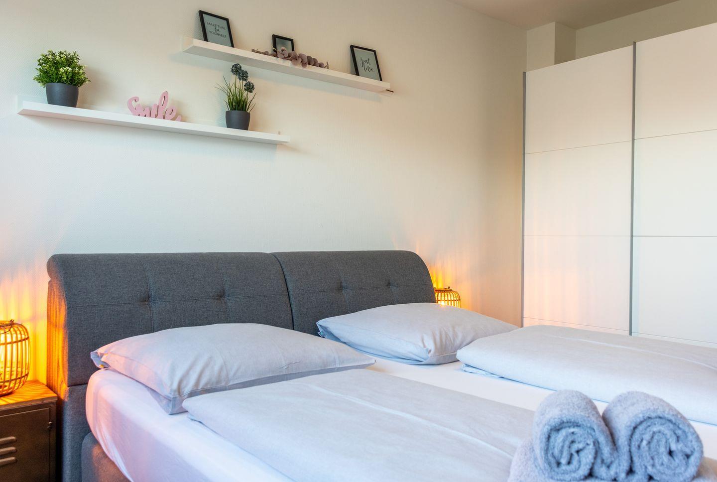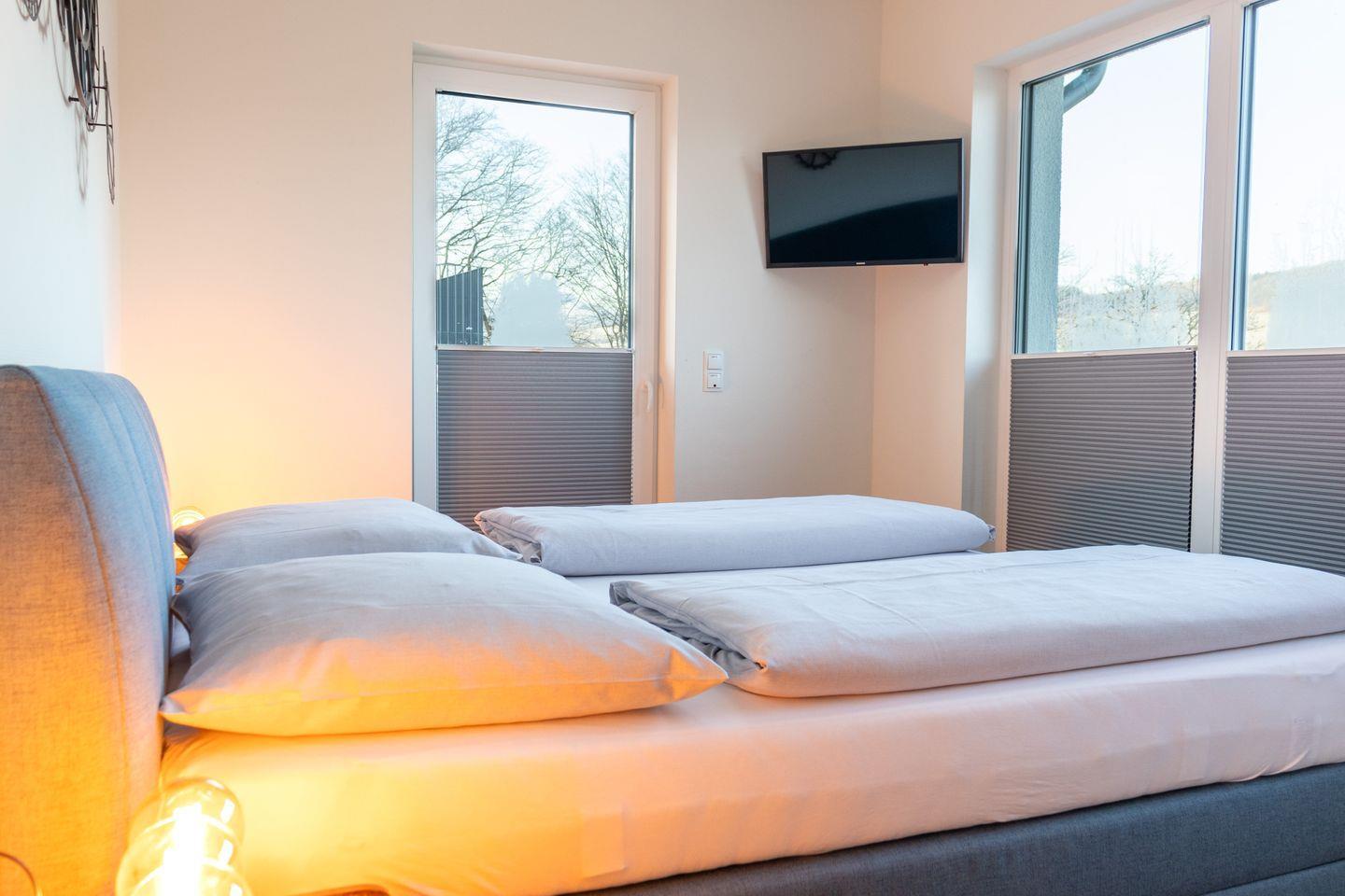 Ein Schlafzimmer befindet sich im Erdgeschoss – ideal für seniorenfreundliches Wohnen, da sich auch ein Badezimmer auf derselben Etage befindet.. Es ist mit einem hochwertigen Boxspringbett (180 × 200 cm), Verdunkelungsplissees und Smart-TV mit Magenta TV ausgestattet.