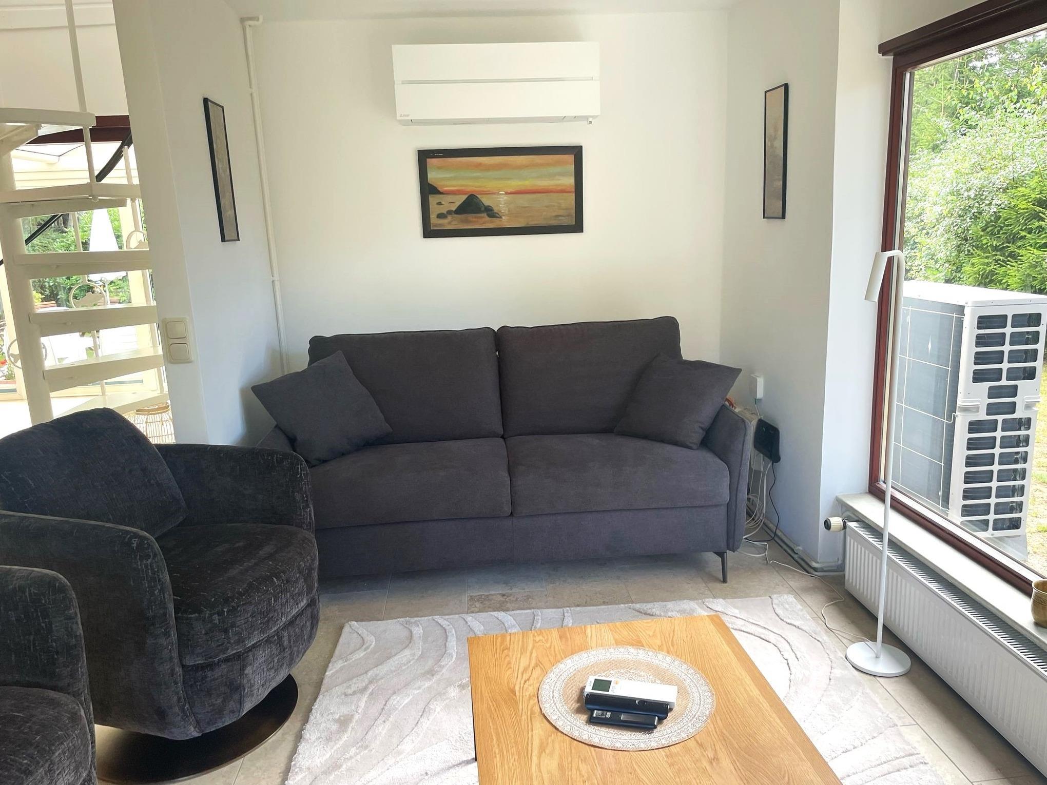 Im Erdgeschoss befindet sich der lichtdurchflutete Wohnbereich mit einem großzügigen Panoramafenster, das nicht nur für viel Tageslicht sorgt, sondern auch einen herrlichen Blick in den Garten bietet. In den heißen Sommermonaten bleibt der Raum angenehm kühl – dank der integrierten Klimaanlage. Direkt vor dem Fenster lädt ein gemütliches Ecksofa zum Entspannen ein, das bei Bedarf als zusätzliche Schlafgelegenheit für ein bis zwei Personen genutzt werden kann.