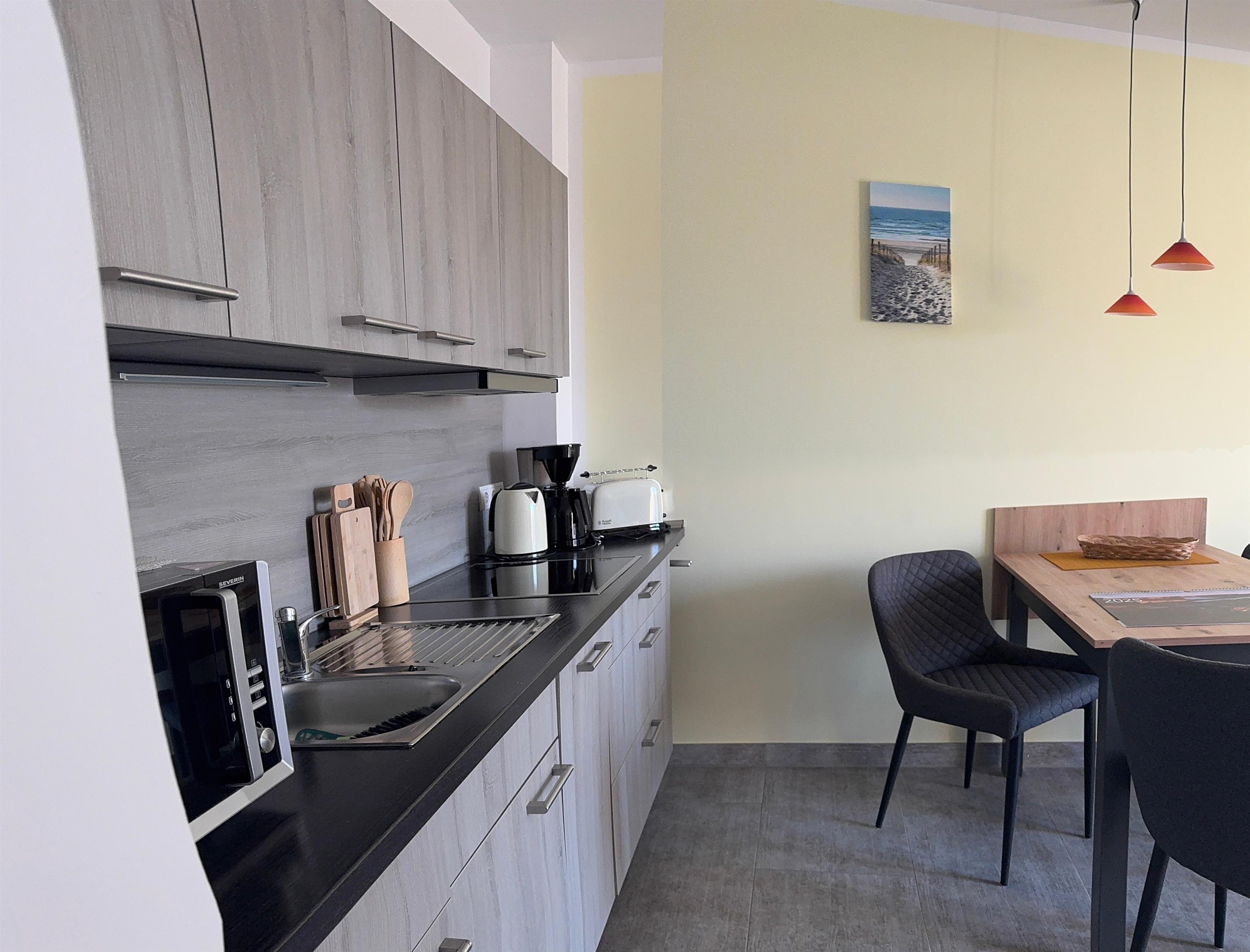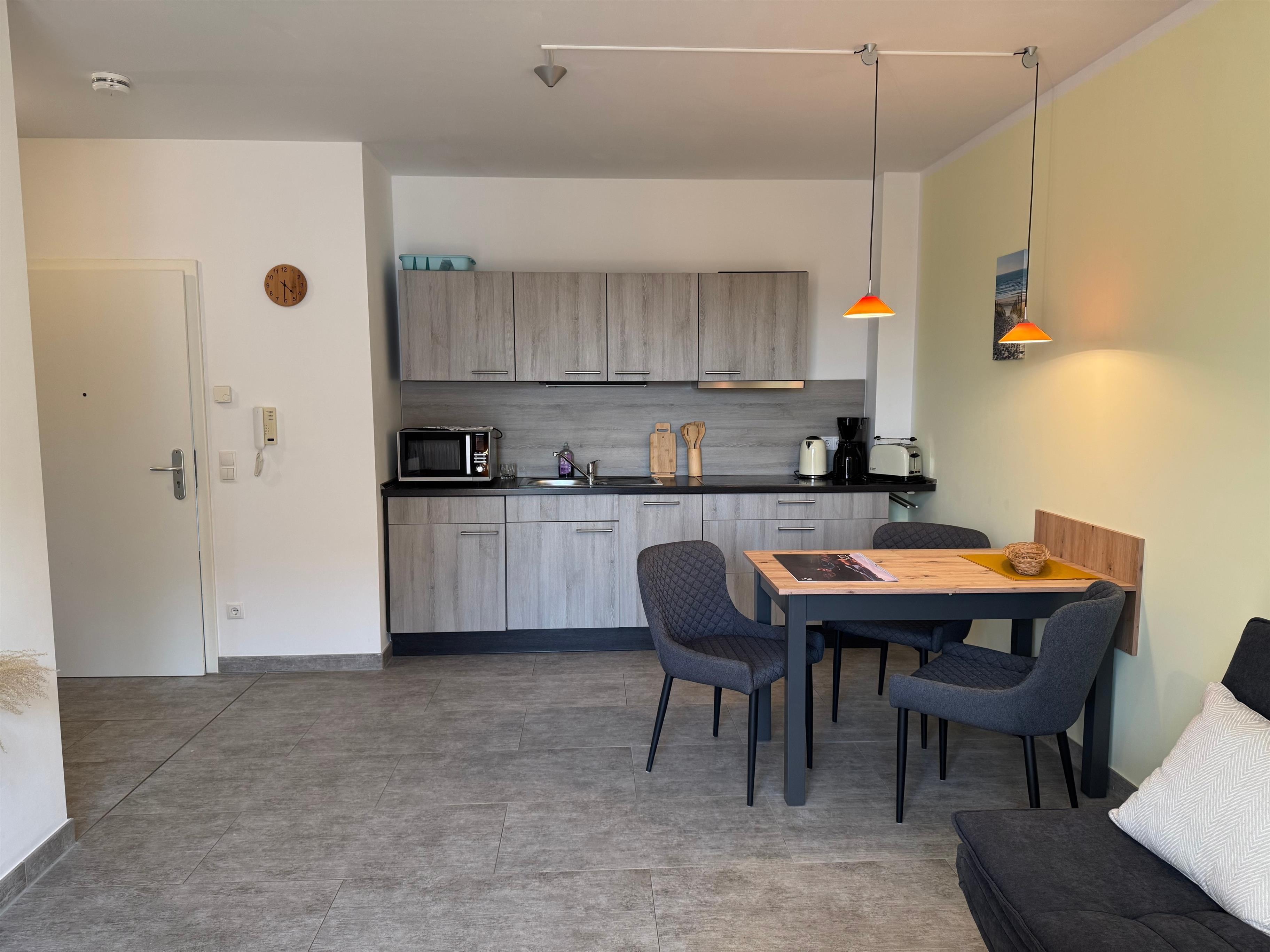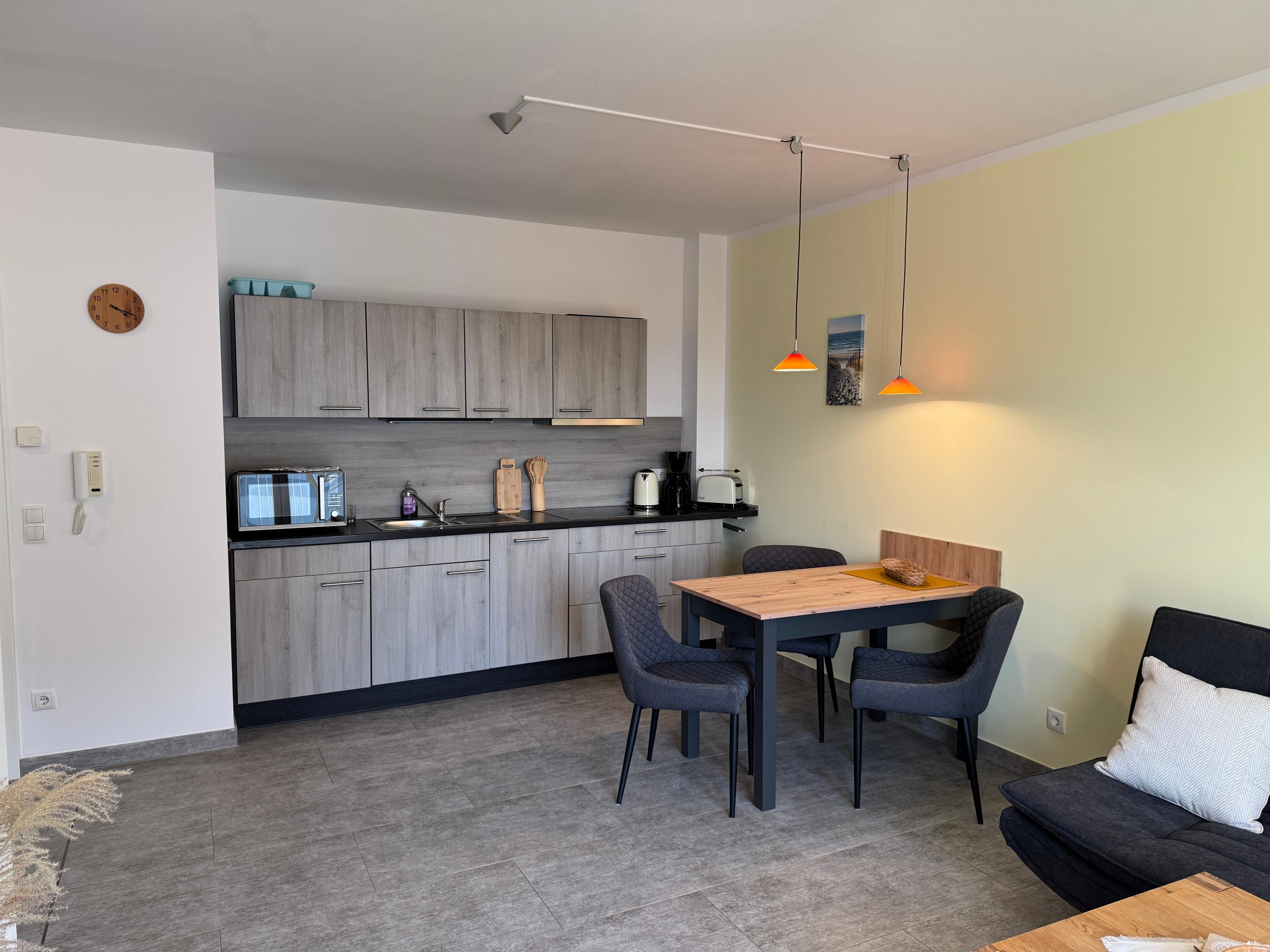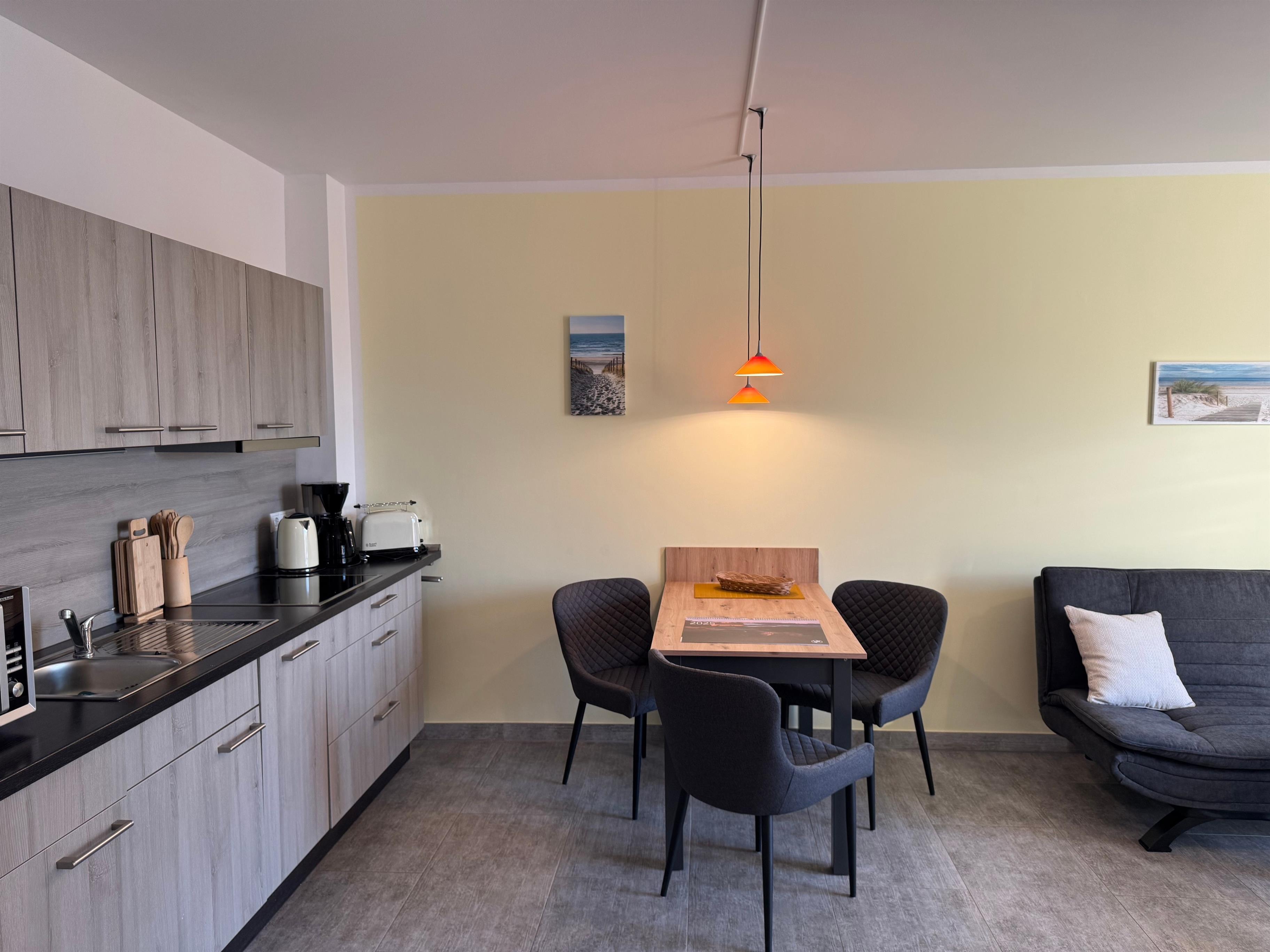 Die moderne gut ausgestattete Küchenzeile mit Kühlschrank mit Gefrierfach, Ceranfeld, Geschirrspüler, Wasserkocher, Toaster, Kaffeemaschine und Mikrowelle ist in dem Wohnraum integriert. Davor befindet sich der großzügige Essplatz.
