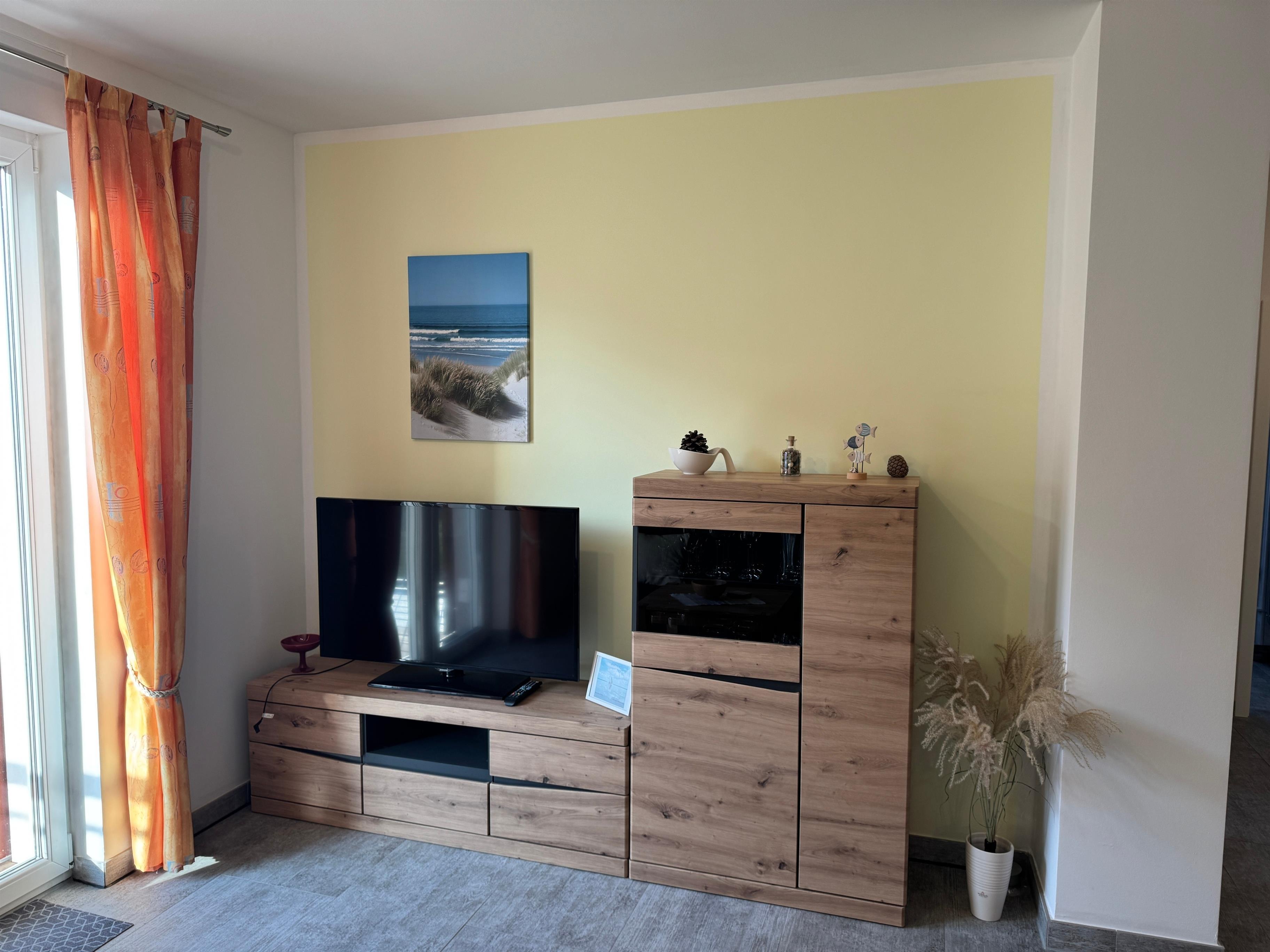 In dem gemütlichen Wohnraum befinden sich ein LED Flachbildschirm und eine ausziehbare Schlafcouch.