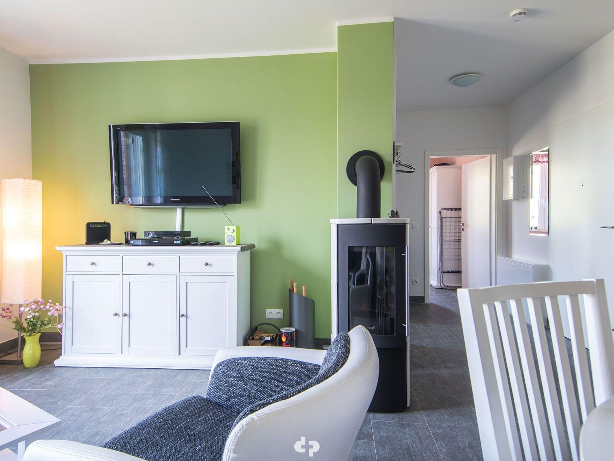 • In dem gemütlich eingerichteten Wohnraum befinden sich ein LED Flachbildschirm, eine gemütliche ausziehbare Schlafcouch 140 x 200 für weitere 2 Personen, eine Anrichte mit DVD Player und ein Kamin. Dieser sorgt in der kalten Jahreszeit für wohlige Wärme und romantisches Flair.
