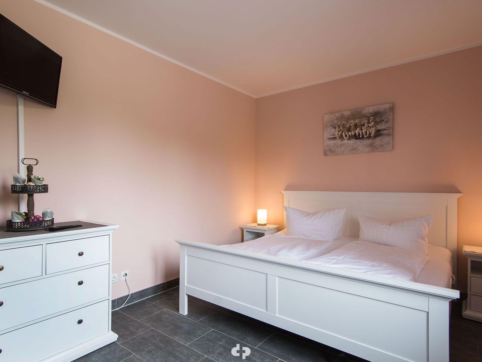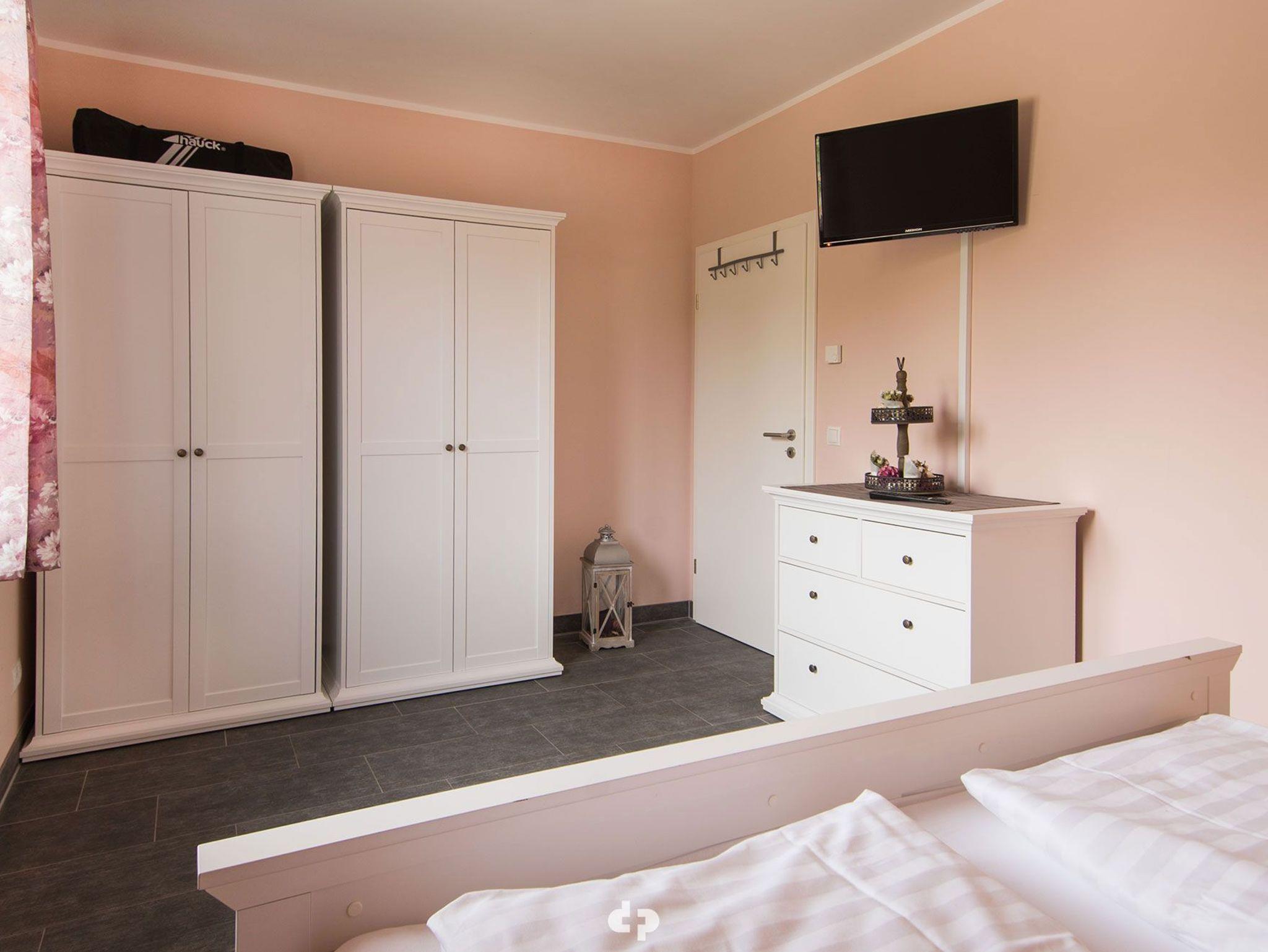 • Zum Schlafzimmer gehören ein Doppelbett 180 x 200, TV, Kleiderschränke und eine Kommode.