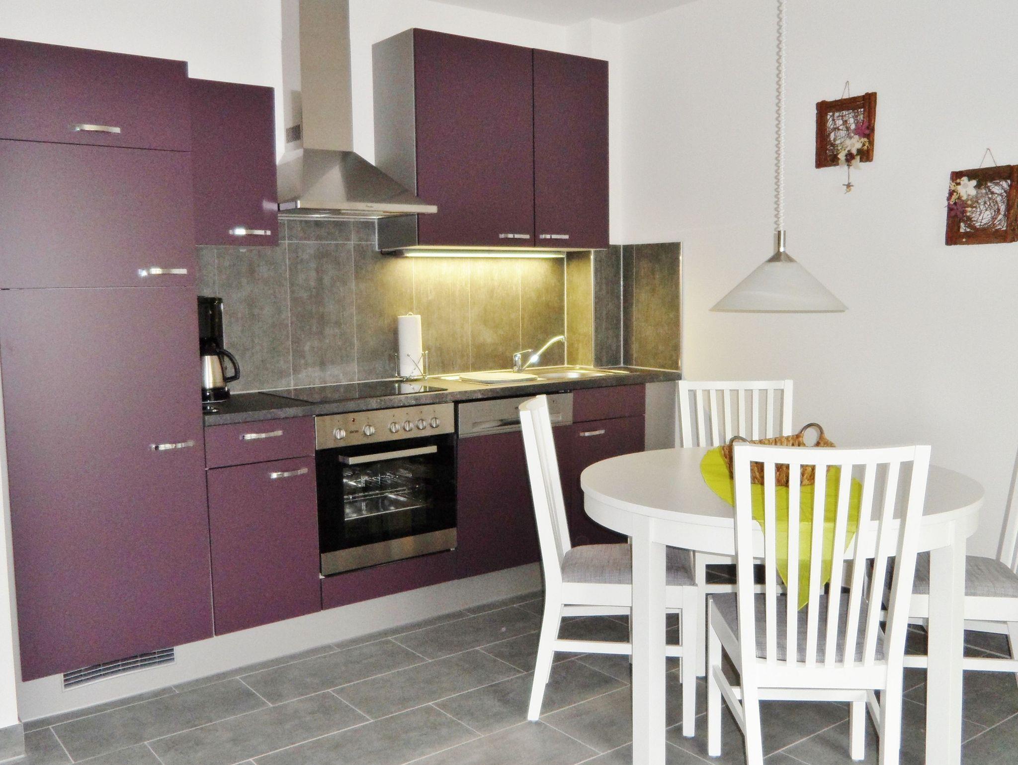 • Die moderne und gut ausgestattete Küchenzeile mit Kühl- und Gefrierschrank, Ceranherd mit Backofen, Geschirrspüler, Wasserkocher und Kaffeemaschine ist in dem Wohnraum integriert. Davor befindet sich der großzügige Essplatz.