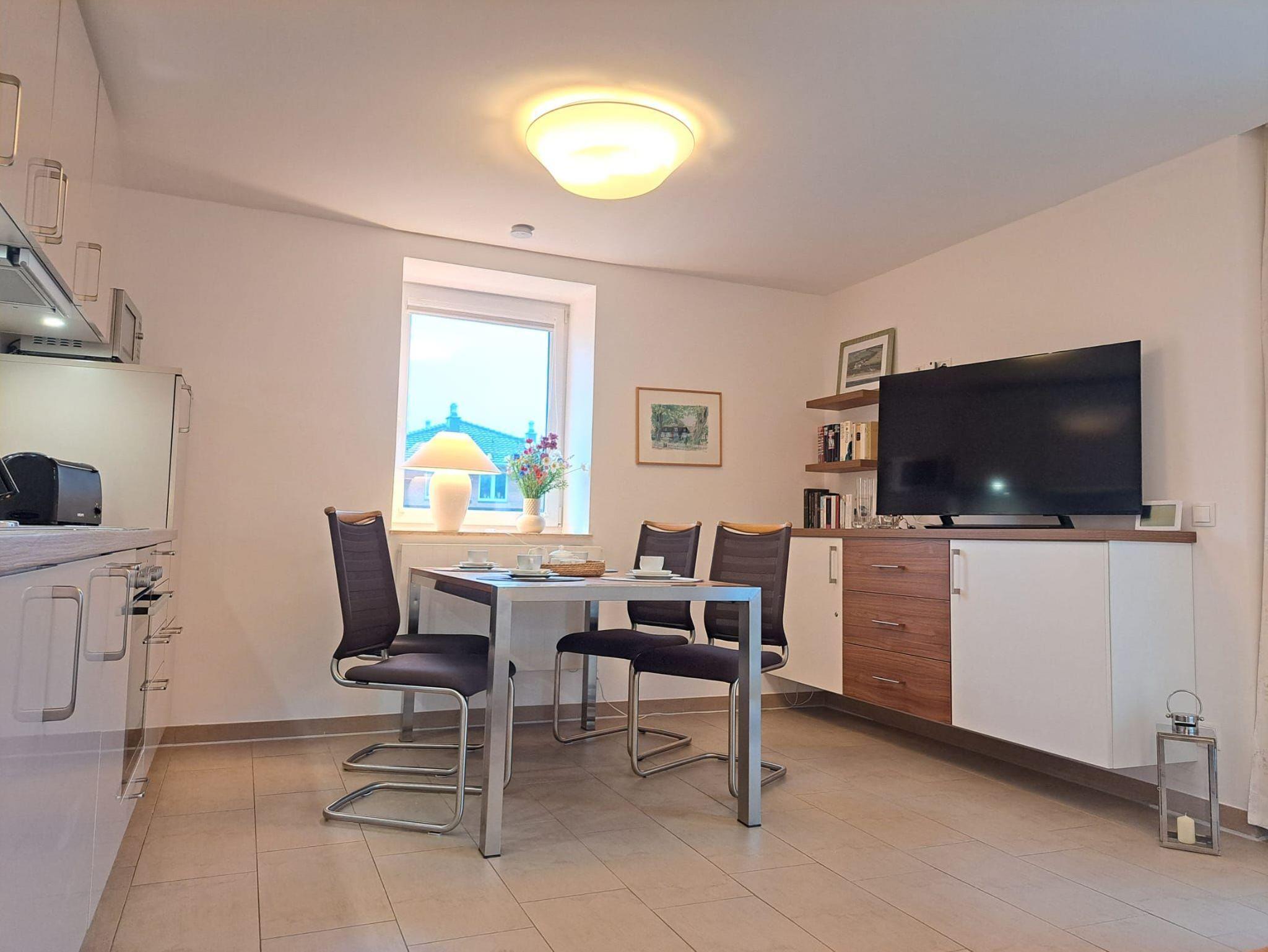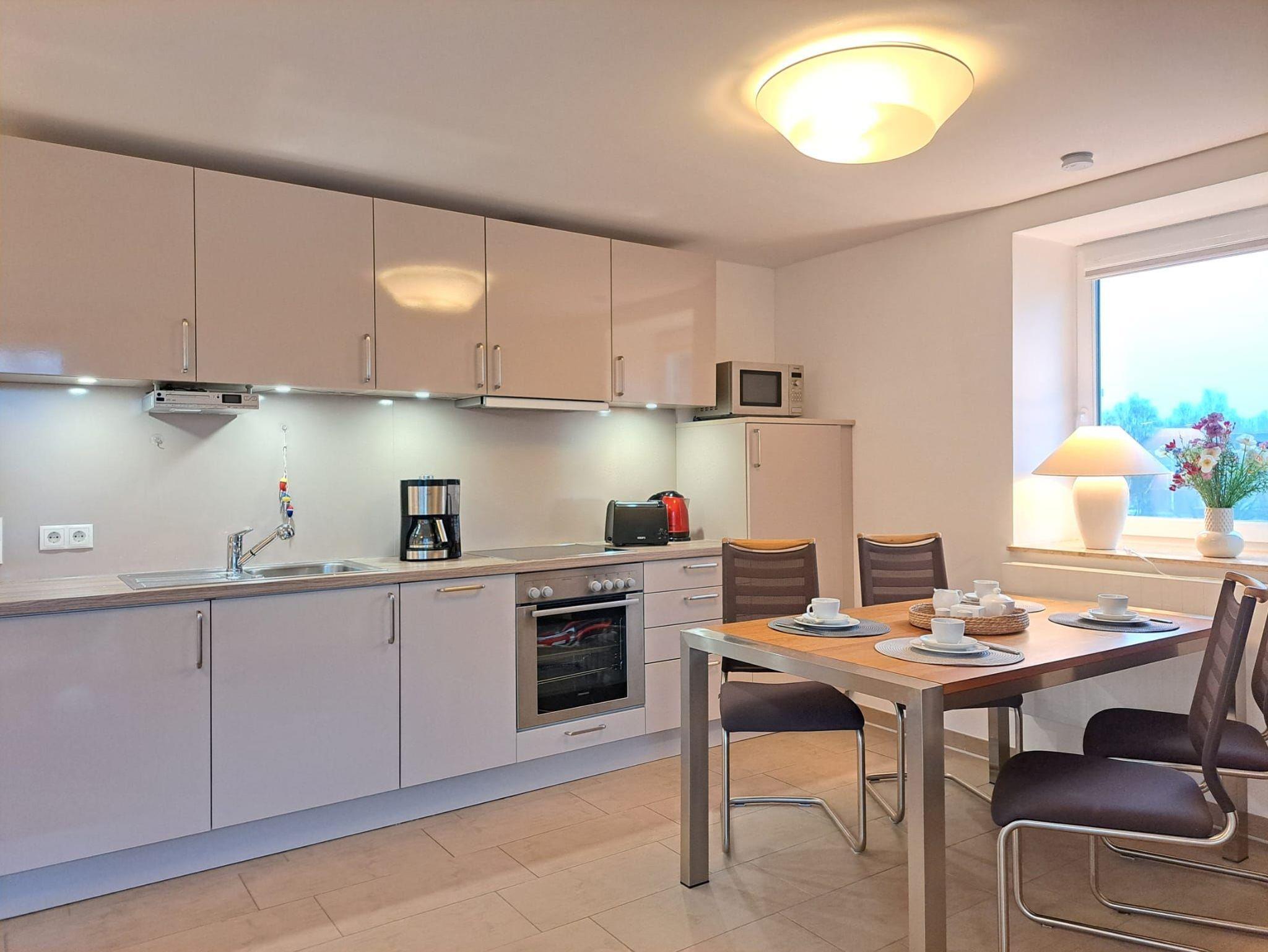 die geschmackvoll, modern eingerichtete Ferienwohnung mit viel Liebe zum Detail liegt im 1. Obergeschoss der Ferienanlage Käpt` Brass mit dem Südseitigem Balkon, lädt Sie zum gemeinsamen frühstücken ein. Genießen Sie den ganzen Tag die Sonne und den weiläufigen Blick auf die Wiesen. Der feinsandige Strand befindet sich in etwa 200 m. Unsere Gäste aus dem Appartement 8 können den kostenlosen Strandkorb nutzen und dabei den Sonnenuntergang am Abend mit einem guten Glas Wein ausklingen lassen. Ein Fahrstuhl steht Ihnen im Eingangsbereich zur Verfügung. Die offenen gestaltete Ferienwohnung mit der Küchenzeile und dem Essplatz lädt zum gemeinsamen kochen und genießen ein. In der Küchenzeile finden Sie alle notwendigen Küchenutensilien. Das offene Wohnzimmer verfügt über eine Couch, kostenlosem WLAN- Zugang und SAT- TV. Für Ihre Nachtruhe steht ein Schlafzimmer mit Doppelbett 1,80 x 2,00 m und getrennten Matratzen und einem großen Schrank mit viel Stauraum bereit. Das Bad mit einer ebenerdigen Dusche und ein separates WC schließen sich an.Der Parkplatz befindet sich direkt vor dem Haus, einen abschließbaren Fahrradabstellraum befindet sich vor dem Hauptgebäude rechts. Alle unsere Wohnungen sind Nichtraucherwohnungen. Der Strandkorb ist von Mai- September verfügbar (wetterbedingt) Die Wohnung wird inclusive Bettwäsche übergeben, Handtücher können in der Zimmervermittlung für 7,00 € pro Person (1 Badetuch, 1 Handtuch) dazugebucht werden.