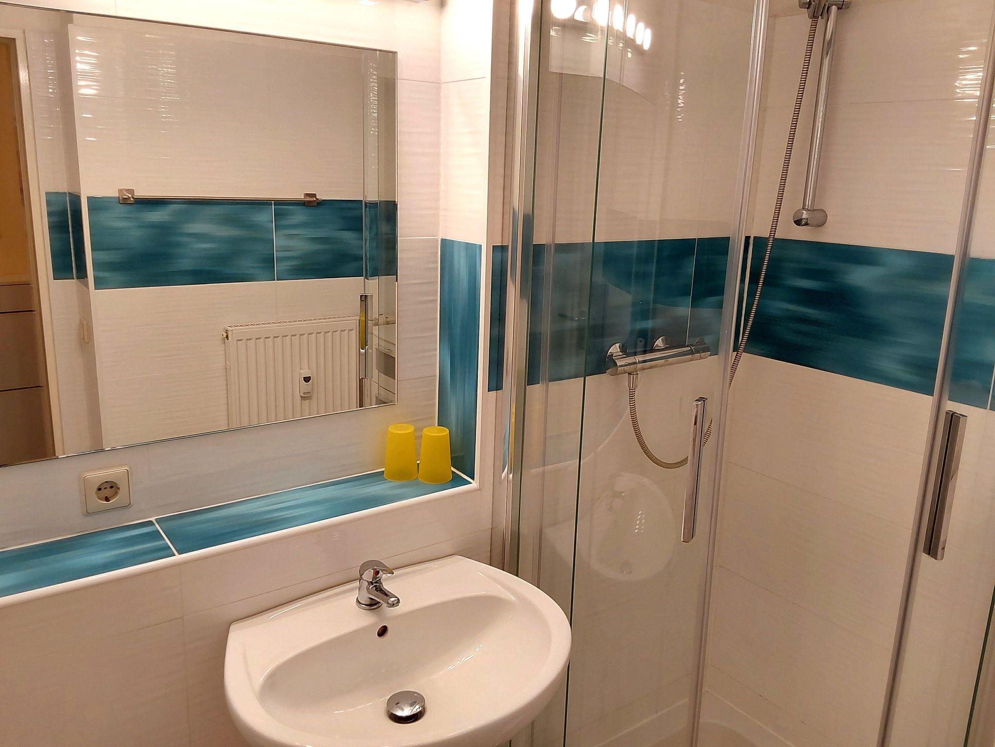 Die FEWO ist für zwei Personen üppig groß und insgesamt gut ausgestattet. Die fehlende Spülmaschine fällt bei zwei Personen kaum ins Gewicht, das fehlende W-Lan ist nicht mehr zeitgemäß. Auch die weißen Plastikstühle auf den Balkonen sollten einmal erneuert werden.
