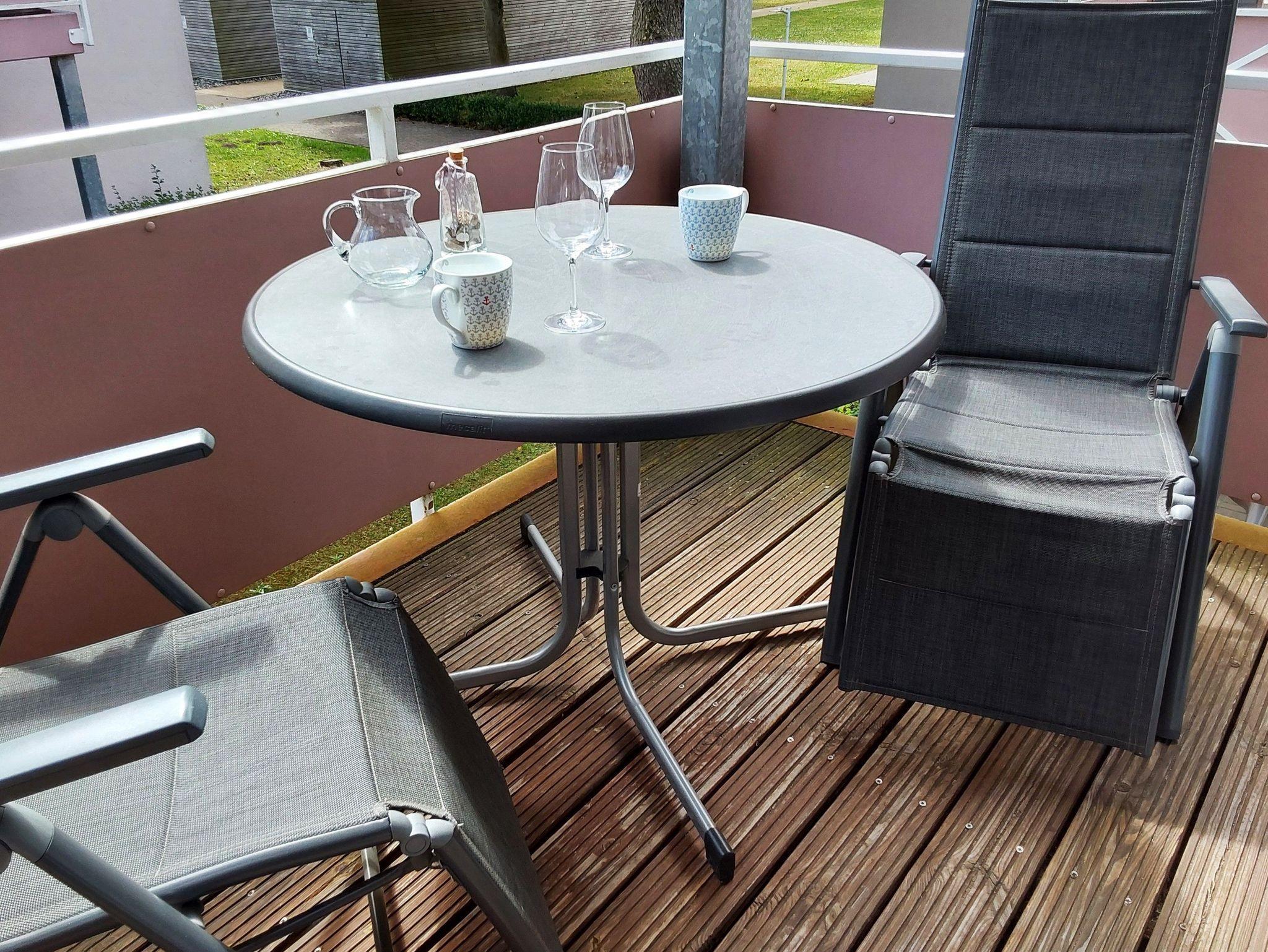 Die FEWO ist für zwei Personen üppig groß und insgesamt gut ausgestattet. Die fehlende Spülmaschine fällt bei zwei Personen kaum ins Gewicht, das fehlende W-Lan ist nicht mehr zeitgemäß. Auch die weißen Plastikstühle auf den Balkonen sollten einmal erneuert werden.