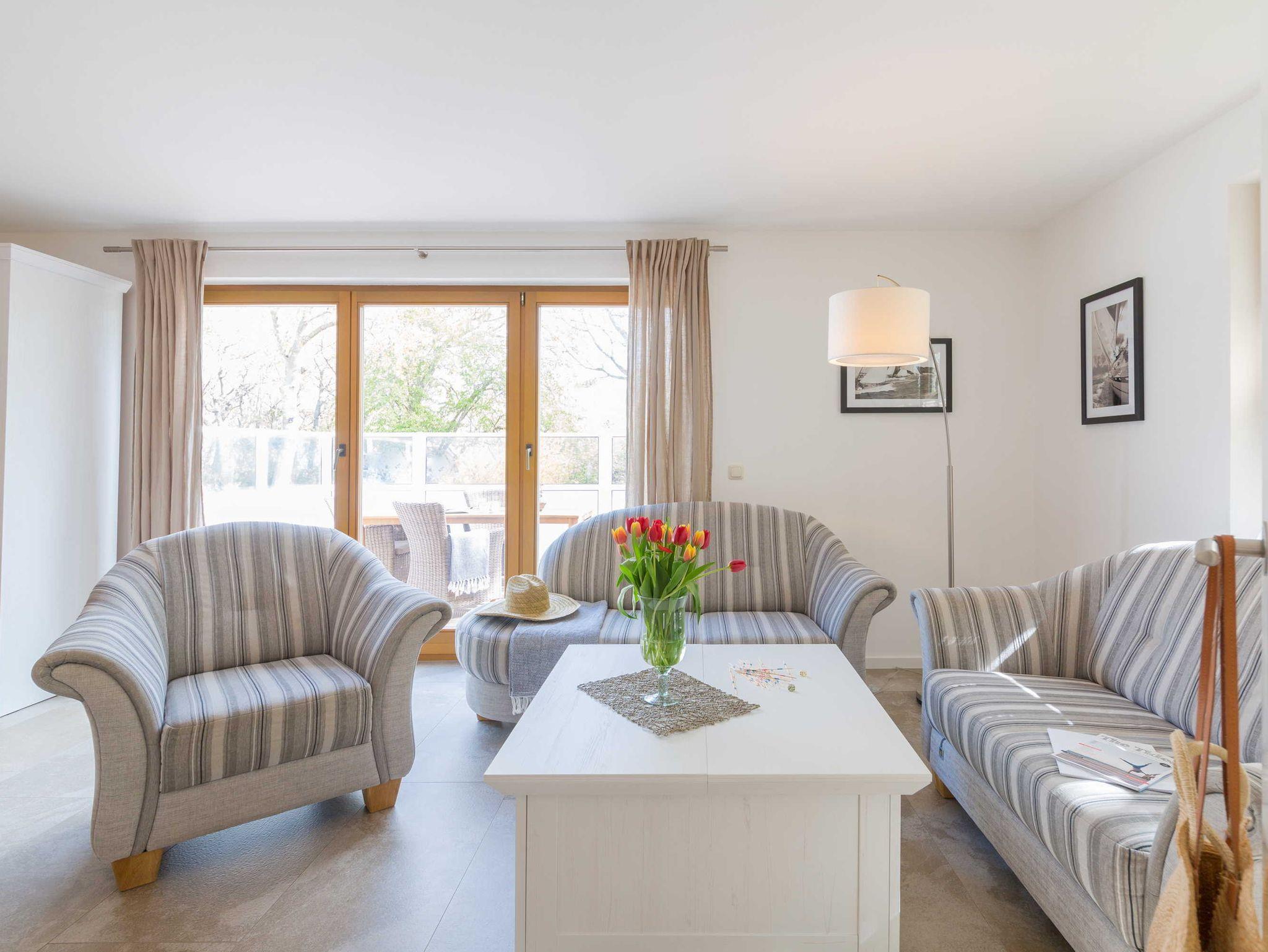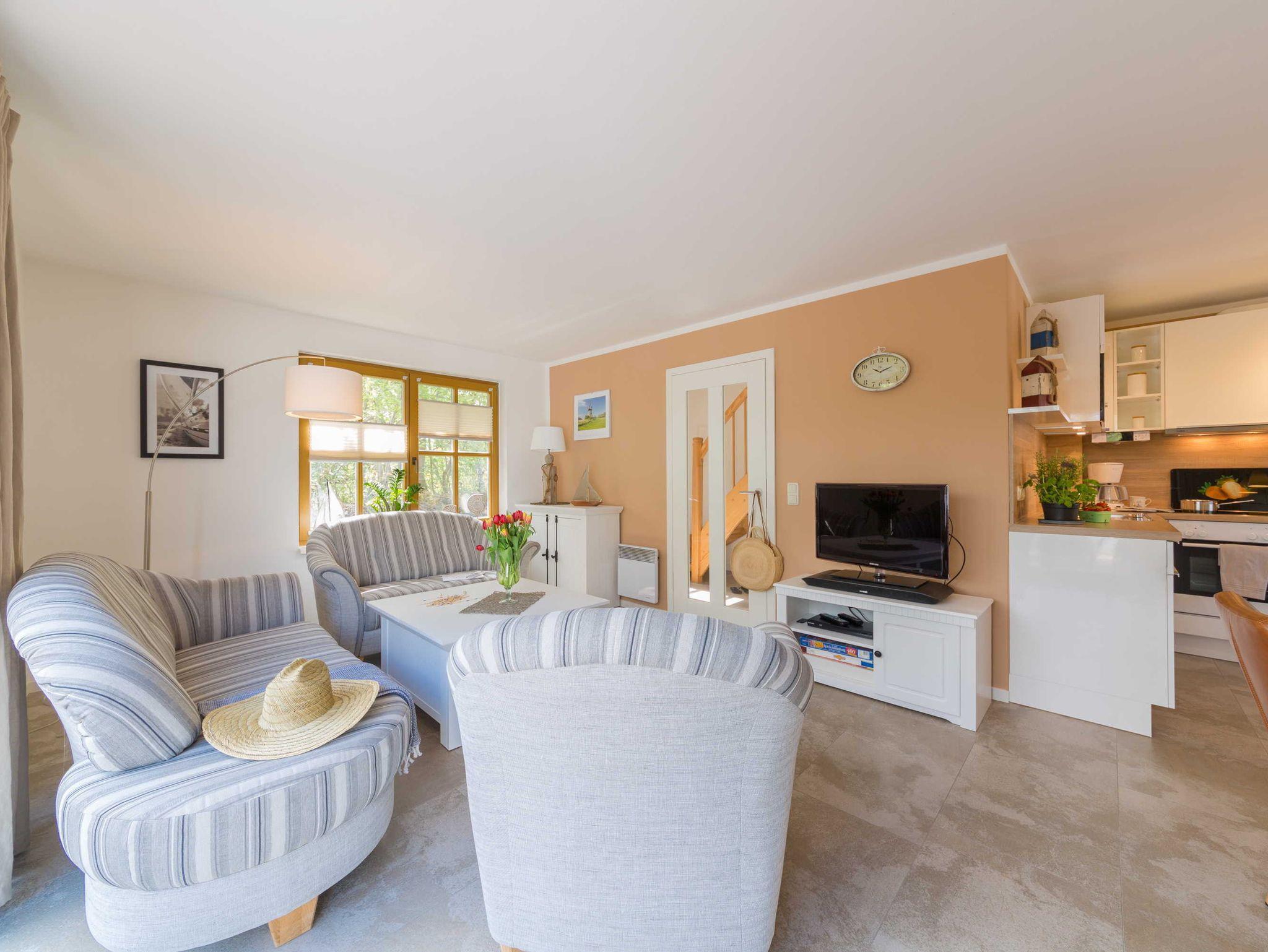 Das offene Wohnzimmer bieten neben einer Couchgarnitur einen Flachbild-TV mit SAT-Empfang und einen Blue-Ray Player. Im Essbereich steht ein großer Tisch mit ausreichend Stühlen. Die Einbauküche ist komplett ausgestattet, u.a. mit Geschirrspüler, Backofen-Herd, Kühlschrank, Kaffeemaschine, Toaster und Wasserkocher.