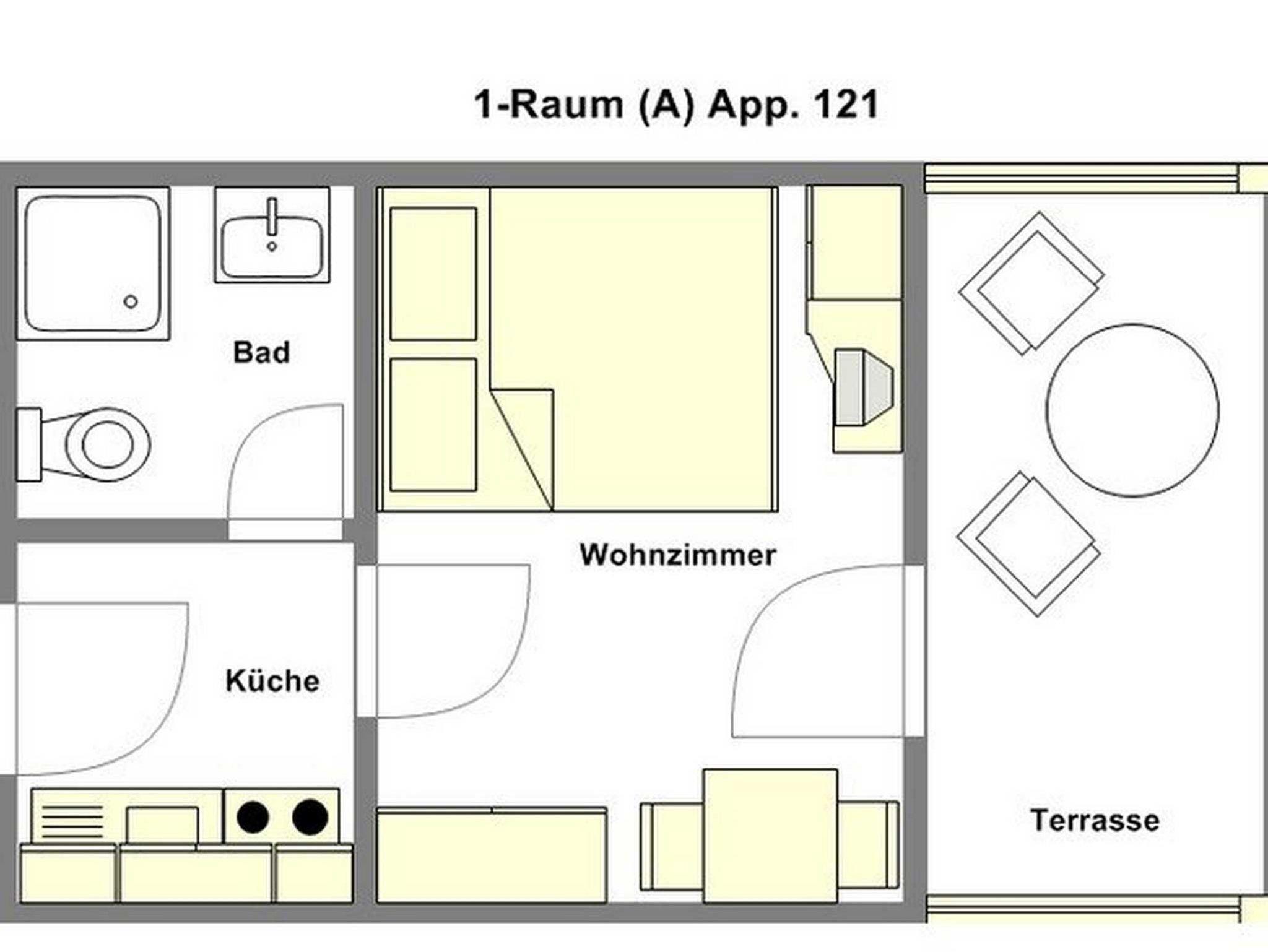 Die modern eingerichteten 1-Raum-Appartements dieser Kategorie sind für maximal 2 Personen geeignet und ca. 21 qm groß. Sie verfügen über einen Wohn-/Schlafraum für 2 Personen. Alle unsere Wohnungen sind Nichtraucher-Wohnungen. Bei einigen Appartements können Sie Ihr Haustier mitbringen (s. Zimmerdaten). Ausstattung: Sat-TV, Radio, Küchenzeile, Dusche/WC, möblierte Terrasse oder Balkon. Bettwäsche und Handtücher als Erstausstattung.