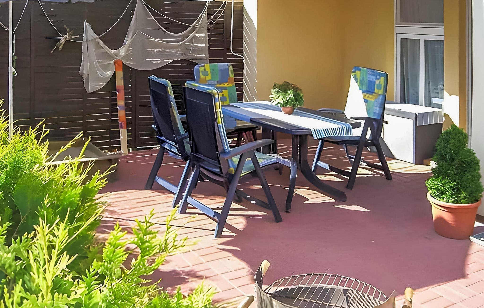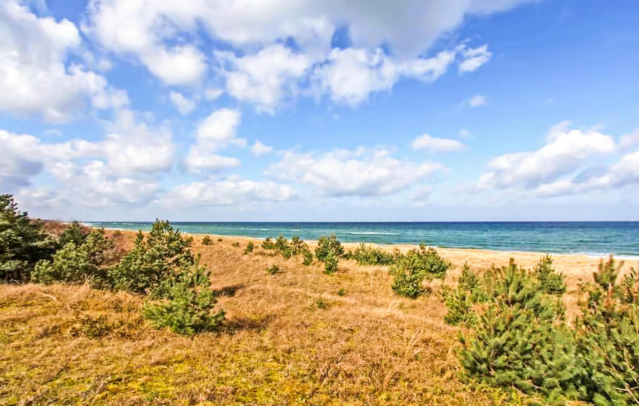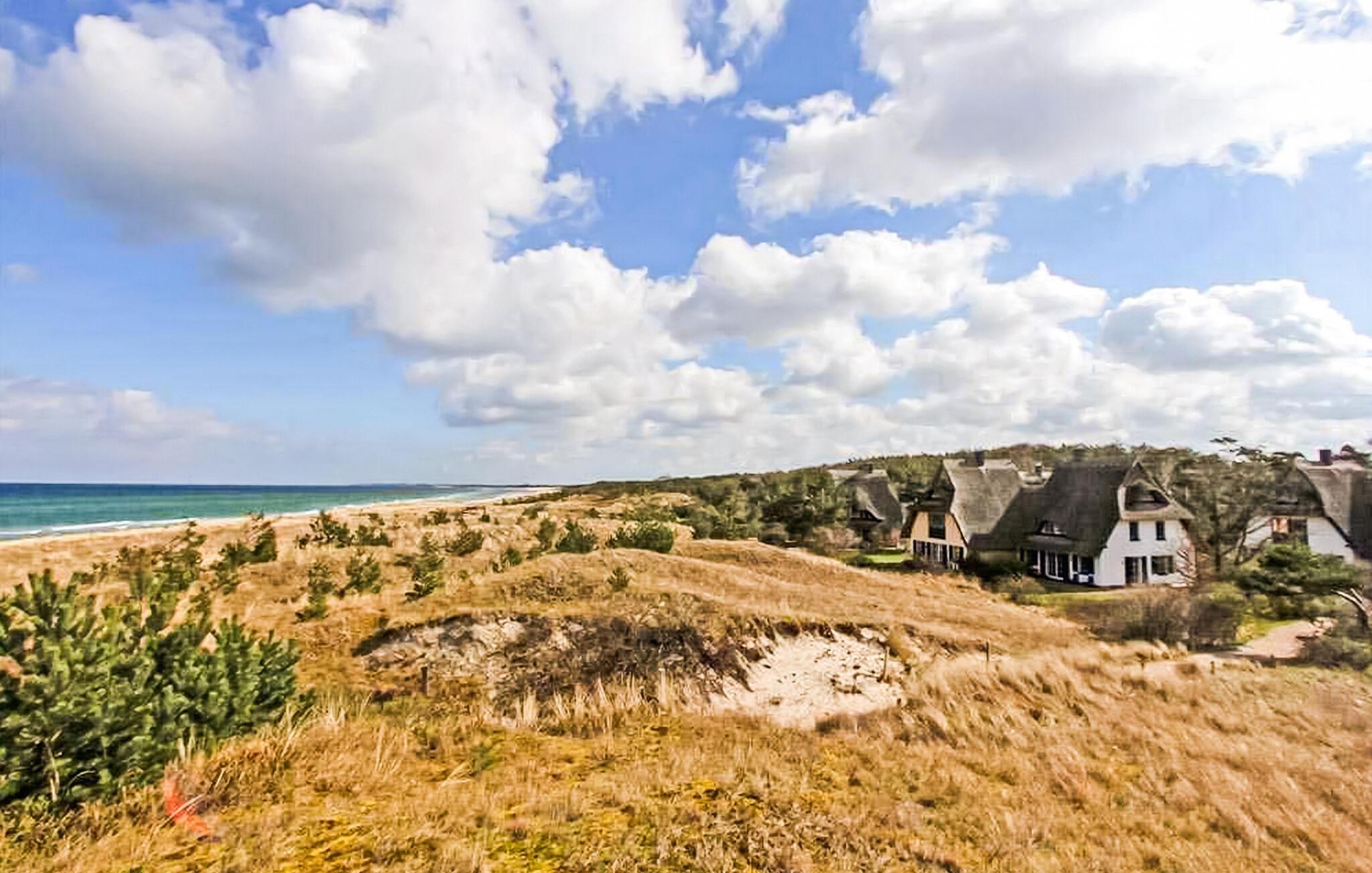 Feriehuset ligger på en separat rekreativ ejendom i et smukt skovområde lige bag klitterne (strand ca. 50 m) i Neuhaus-kvarteret. Udstyr i stueetagen med køkken-alrum (spisebord med stor hjørnebænk, fladskærms-tv, radio, el-komfur med ovn, køleskab med fryser, mikroovn, diverse køkkenmaskiner), soveværelse (dobbeltseng, 1 babyseng) der kan tilføjes) og bad/toilet med vaskemaskine. Vaskemaskinen kan kun bruges fra maj til oktober. På 1. sal er der opholdsstue (polstrede møbler med sovefunktion, fladskærms-tv, radio/cd, spisebord) og endnu en soveafdeling med 2 enkeltsenge (skillevæg uden dør). Huset er centralt opvarmet. WiFi, terrasse, grill og parkeringsplads er til rådighed. Den samlede pris inkluderer slutrengøring, sengetøj, vand og energiforbrug. Håndklæder skal medbringes. Dierhagen med sine distrikter Neuhaus og Dändorf er et velkendt feriested ved Østersøen i Fischland. Til “Amber City” Ribnitz-Damgarten med det berømte ravmuseum ligger cirka 8 km væk. Bred sandstrand i Neuhaus.