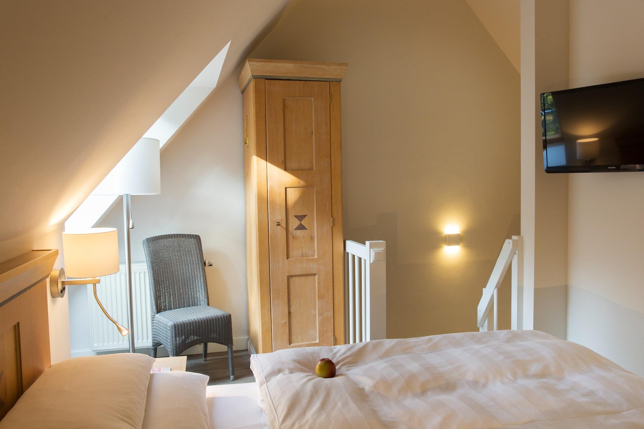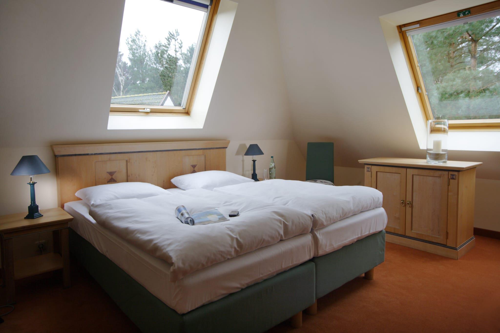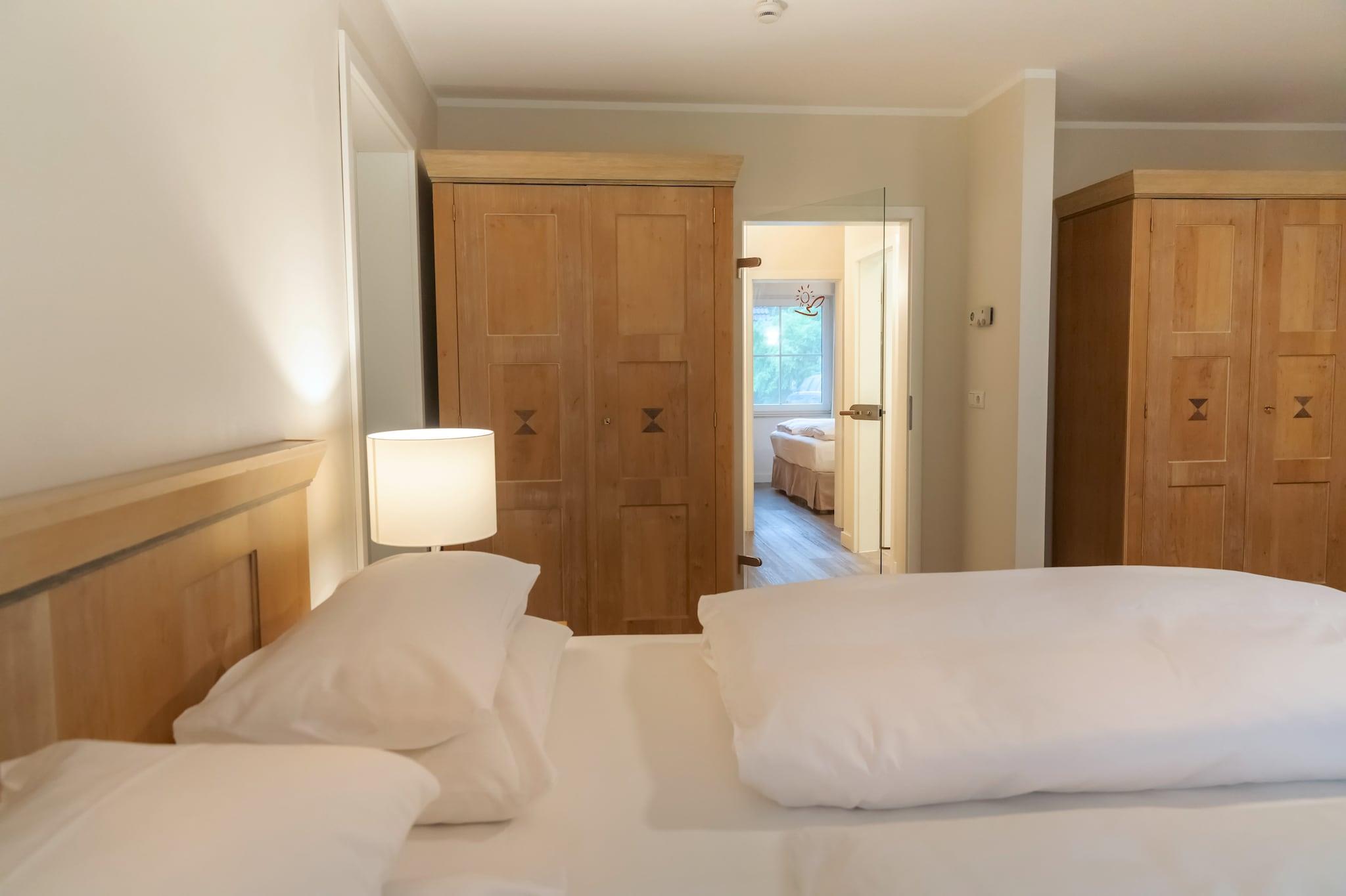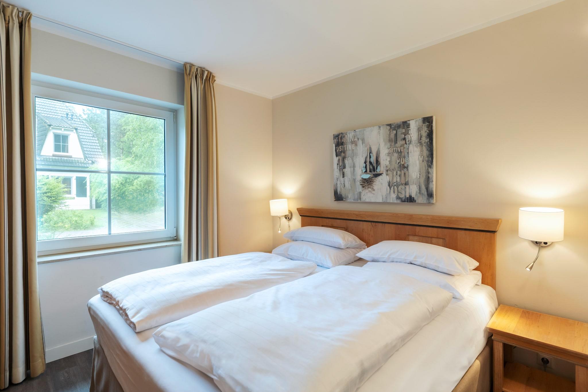 Dette rummelige feriehus med tre soveværelser og to badeværelser tilbyder masser af plads til op til 6 personer – perfekt til familier eller en ferie med venner. Stueetagen har et moderne, fuldt udstyret køkken med opvaskemaskine, en lys opholds- og spisestue med pejs, et soveværelse med dobbeltseng og et badeværelse med bruser eller badekar. Ovenpå er der yderligere to soveværelser – det ene med dobbeltseng og tv, det andet med to enkeltsenge – samt et ekstra toilet. Prisen inkluderer internetadgang i hele hotellet og gratis parkering. Det 4.500 m² store wellness- og spa-område med swimmingpool, saunakompleks og stort fitnessrum kan benyttes mod et gebyr: swimmingpool og sauna koster EURO20 pr. person/dag, og fitnessområdet koster EURO15 pr. person/dag. Daglige aktiviteter såsom yoga, vandfitness og rygfitness afrunder programmet. I skoleferierne venter et varieret børnepasningsprogram på børnene. Skift af sengetøj er inkluderet ved ophold på 7 dage eller mere; yderligere mellemrengøring med skift af sengetøj kan bookes på stedet for EURO150.