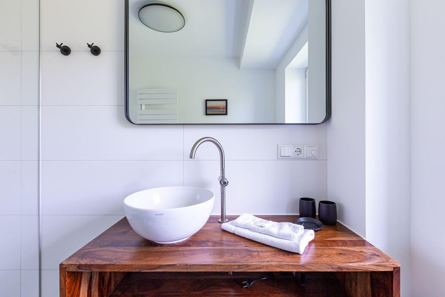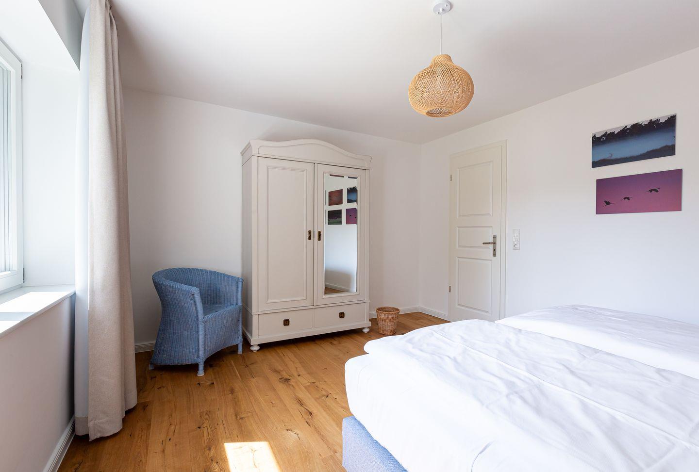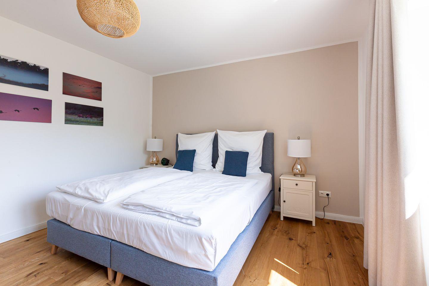 Willkommen in deinem ganz persönlichen Rückzugsort. In Eenhoorn erwartet dich hochwertiges Interieur, das Stil und Komfort perfekt miteinander verbindet. Die offene Küche ist das Herzstück des Hauses und lädt dazu ein, gemeinsam zu kochen und gesellige Stunden am großen Esstisch zu verbringen. Im Wohnzimmer befindet sich ein gemütliches Sofa, auf dem du dich am Abend vor dem knisternden Kamin entspannen kannst. Das Erdgeschoss beherbergt außerdem ein urgemütliches und liebevoll eingerichtetes Schlafzimmer sowie ein erstes Duschbad. In der oberen Etage erwarten dich zwei weitere heimelige Schlafzimmer - eins mit Doppelbett und eins mit getrennten Betten, dass sich sehr gut als Kinderzimmer nutzen lässt. Kleiderschränke, Verdunklungsmöglichkeiten und Insektenschutz an den Fenstern sorgen zudem für einen erholsamen Schlaf. Ein echtes Highlight: Das Traumbad mit einer Badewanne, von der du einen atemberaubenden Blick auf den Bodden genießt. Die große Regendusche und das stylische Sofa im Bad machen diesen Ort zu einer Wohlfühloase und runden das Luxus-Feeling perfekt ab.